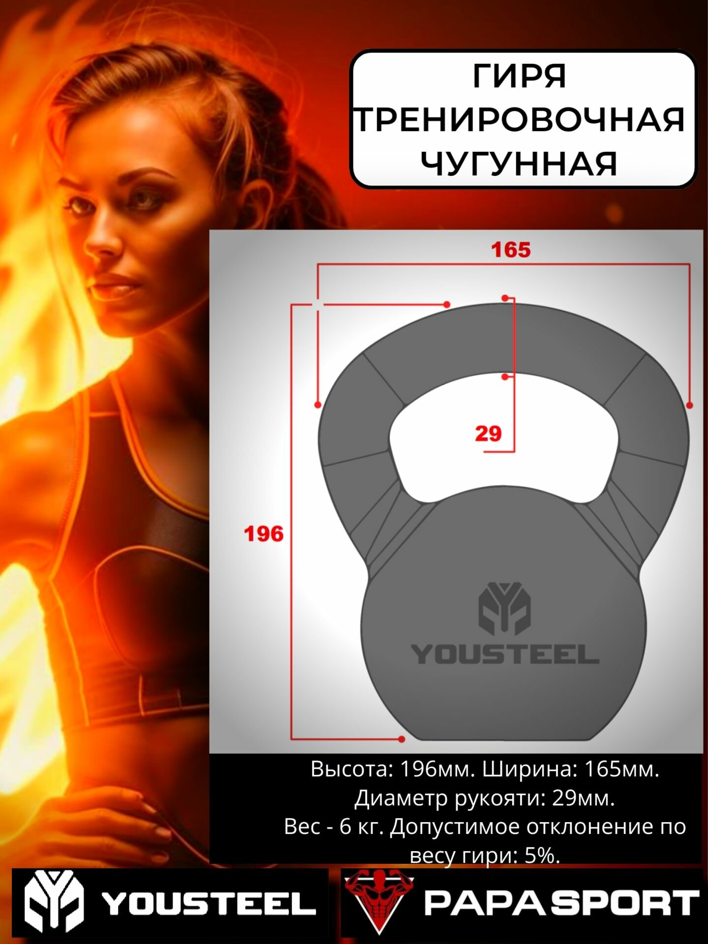 Гиря для кроссфита YOUSTEEL 6 кг, цельнолитая, чугунная интересное: