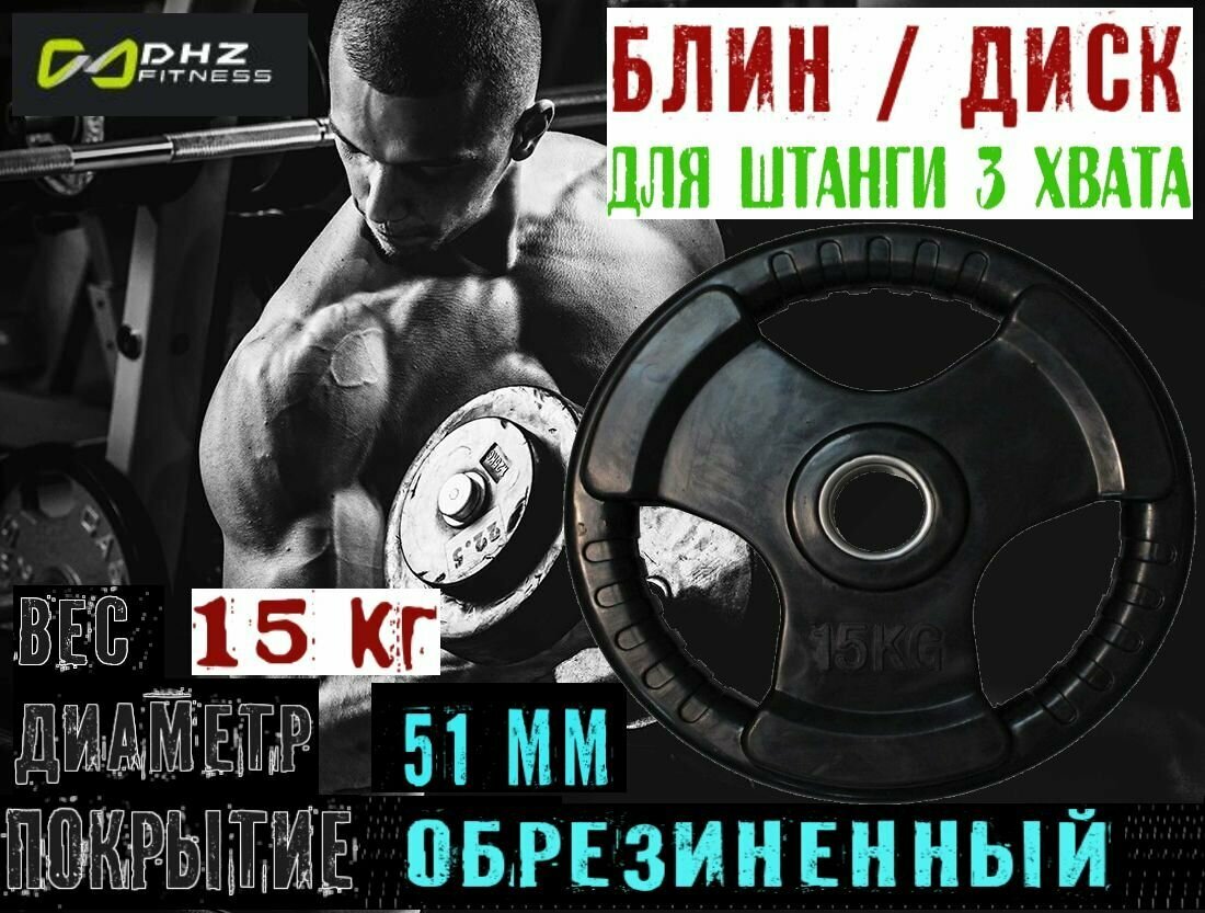 Диск блин для штанги с тройным хватом ZSO, диаметр 51, цвет - черный, обрезиненный, вес - 15 кг интересное: