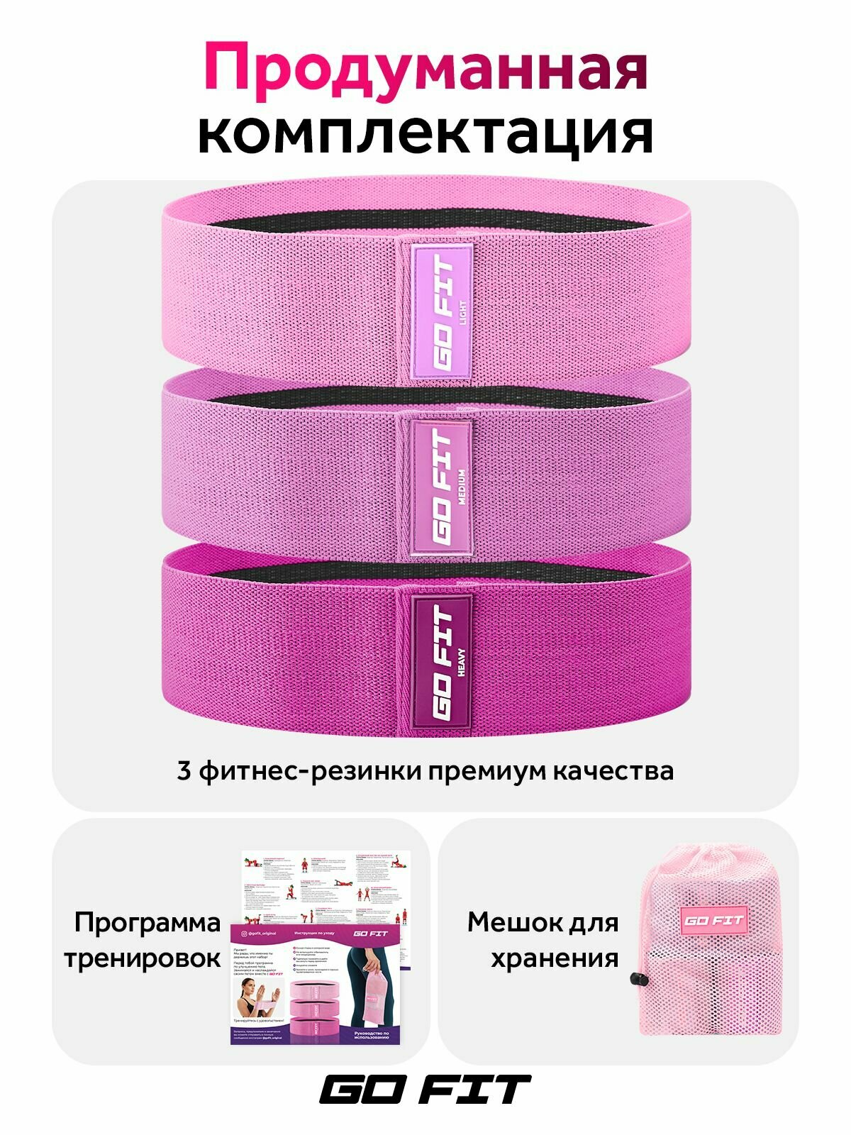 Тканевые фитнес-резинки GO FIT Premium, для йоги, пилатеса, фитнеса, мешочек и программа тренировок, набор 3 шт, Pink интересное: