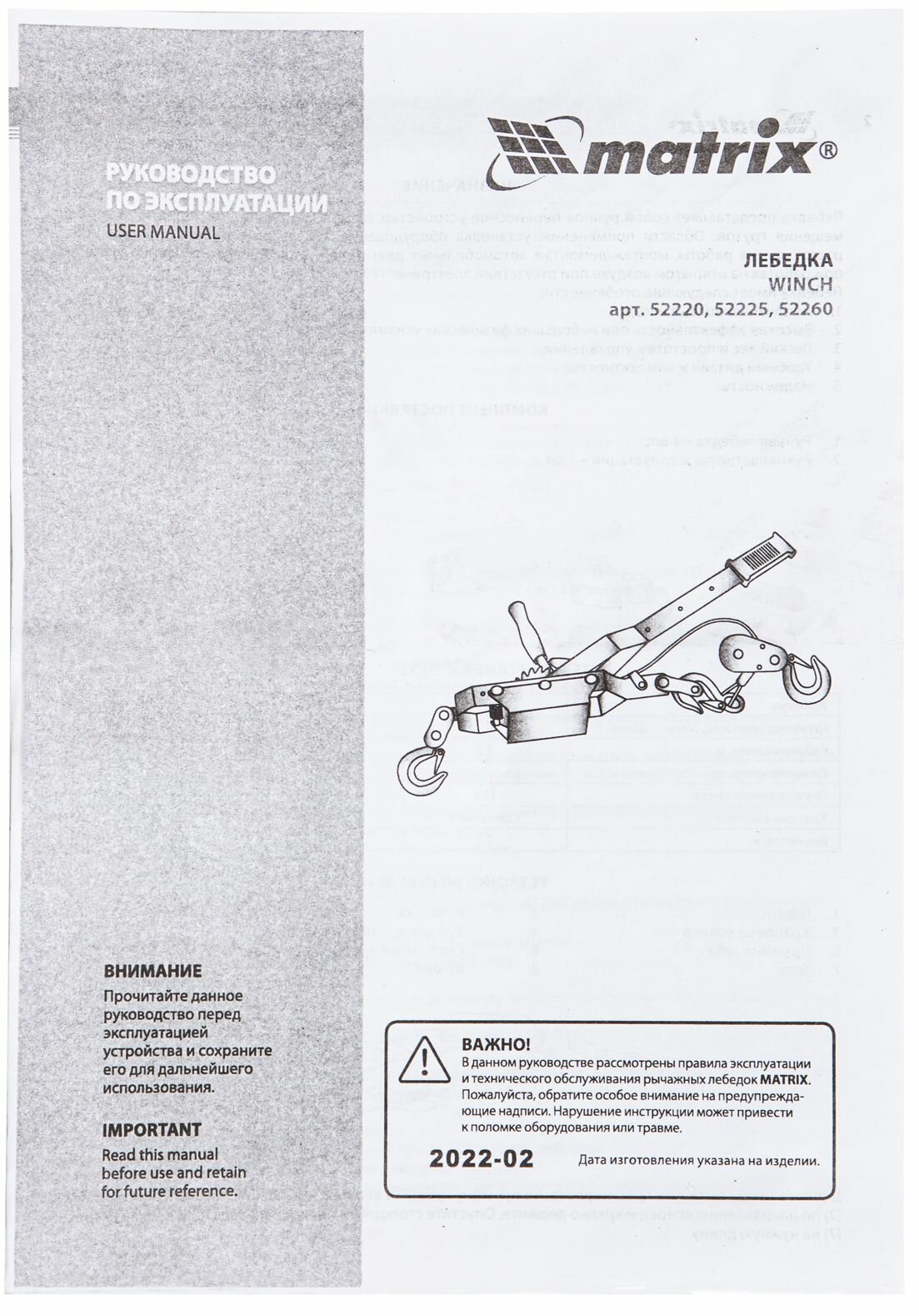 Лебедка рычажная, тяга 2 т, подъем 0.8 т, одинарное храповое колесо Matrix 52220 интересное: