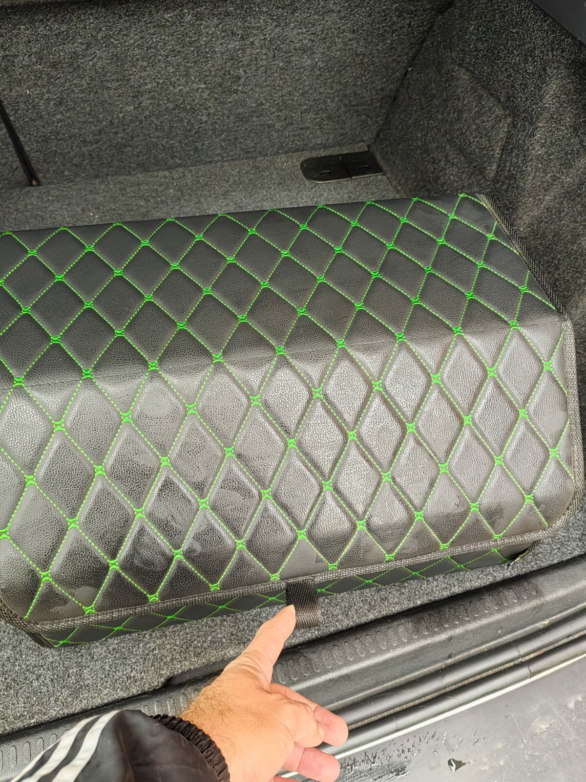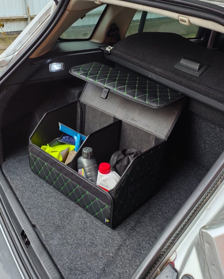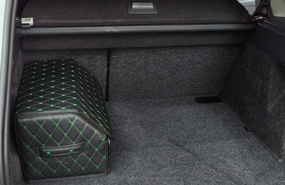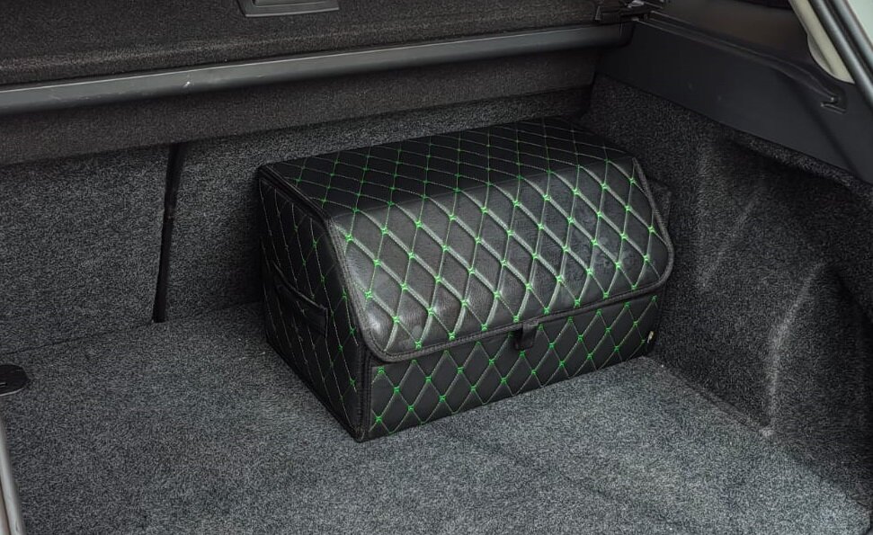 СохранитьСумка-органайзер Autozoom в багажник /сумка-саквояж универсальная для автомобиля / кофр в багажник авто/. Экокожа черная, строчка зеленый ромб интересное: