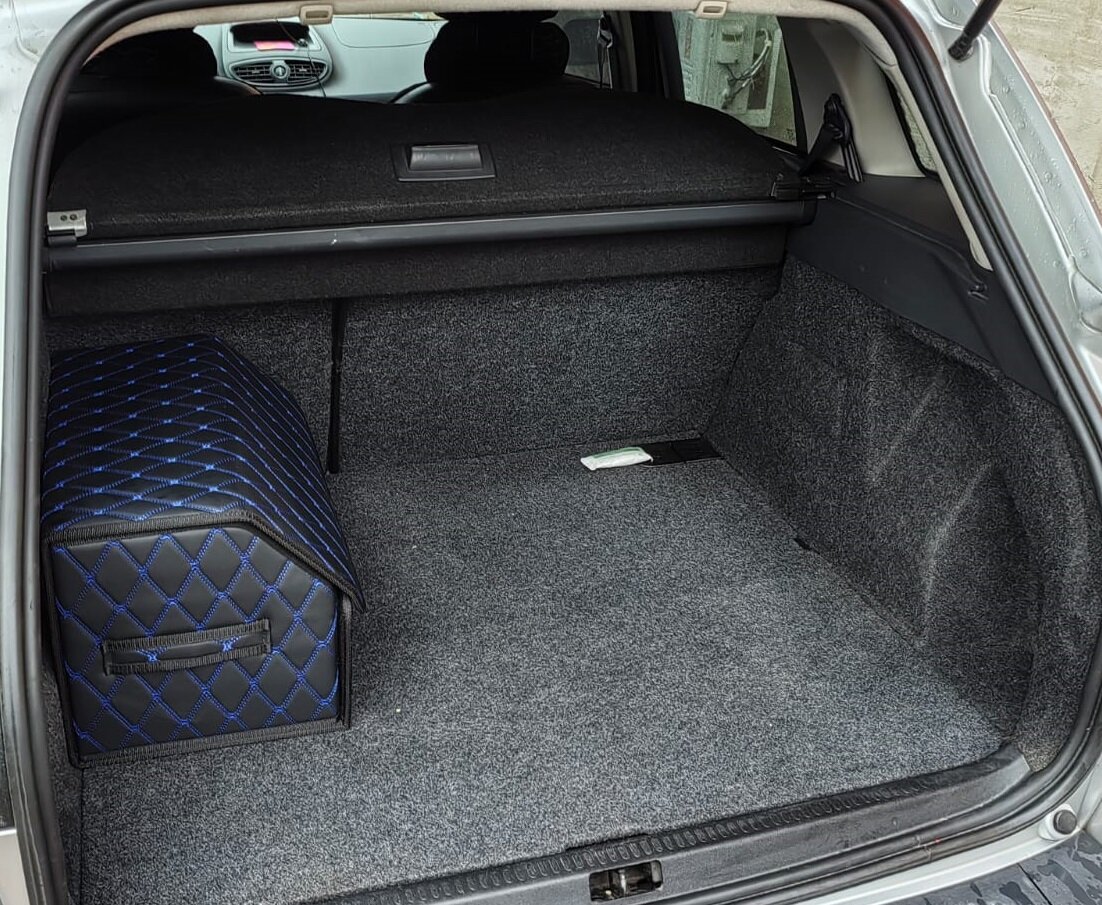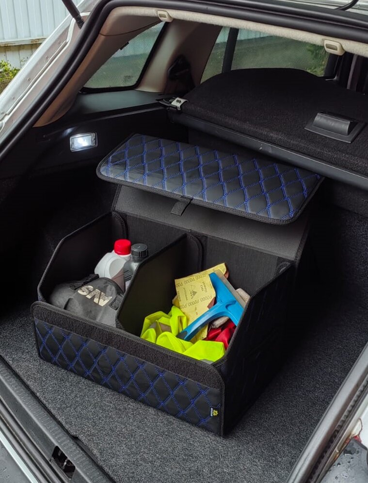 СохранитьСумка-органайзер Autozoom в багажник /сумка-саквояж универсальная для автомобиля / кофр в багажник авто. Экокожа черная, стежка двойной синий ромб интересное: