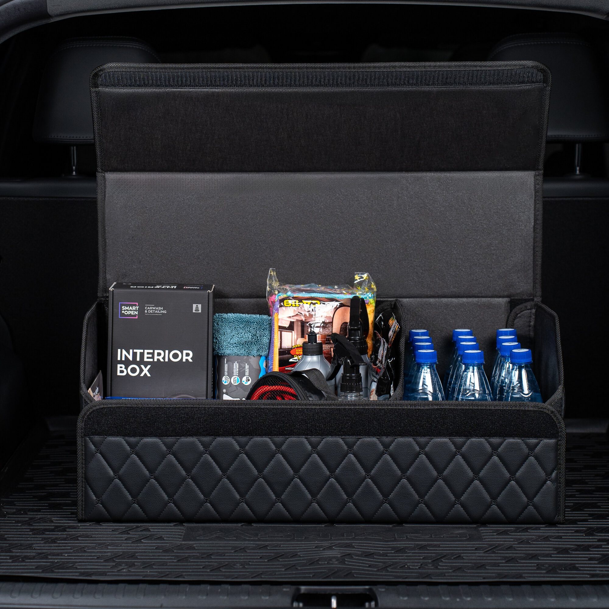 Саквояж в багажник автомобильный эко кожа черная синий ромб, объем 45 л