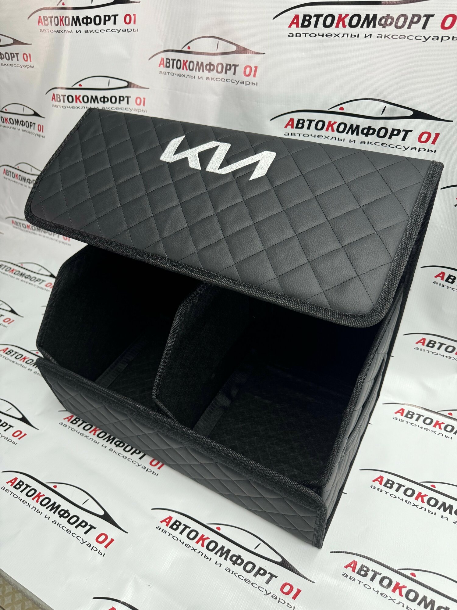 Купить Органайзер в багажник с логотипом Kia (Киа) 50 см. Кожзам, ромб, черный.