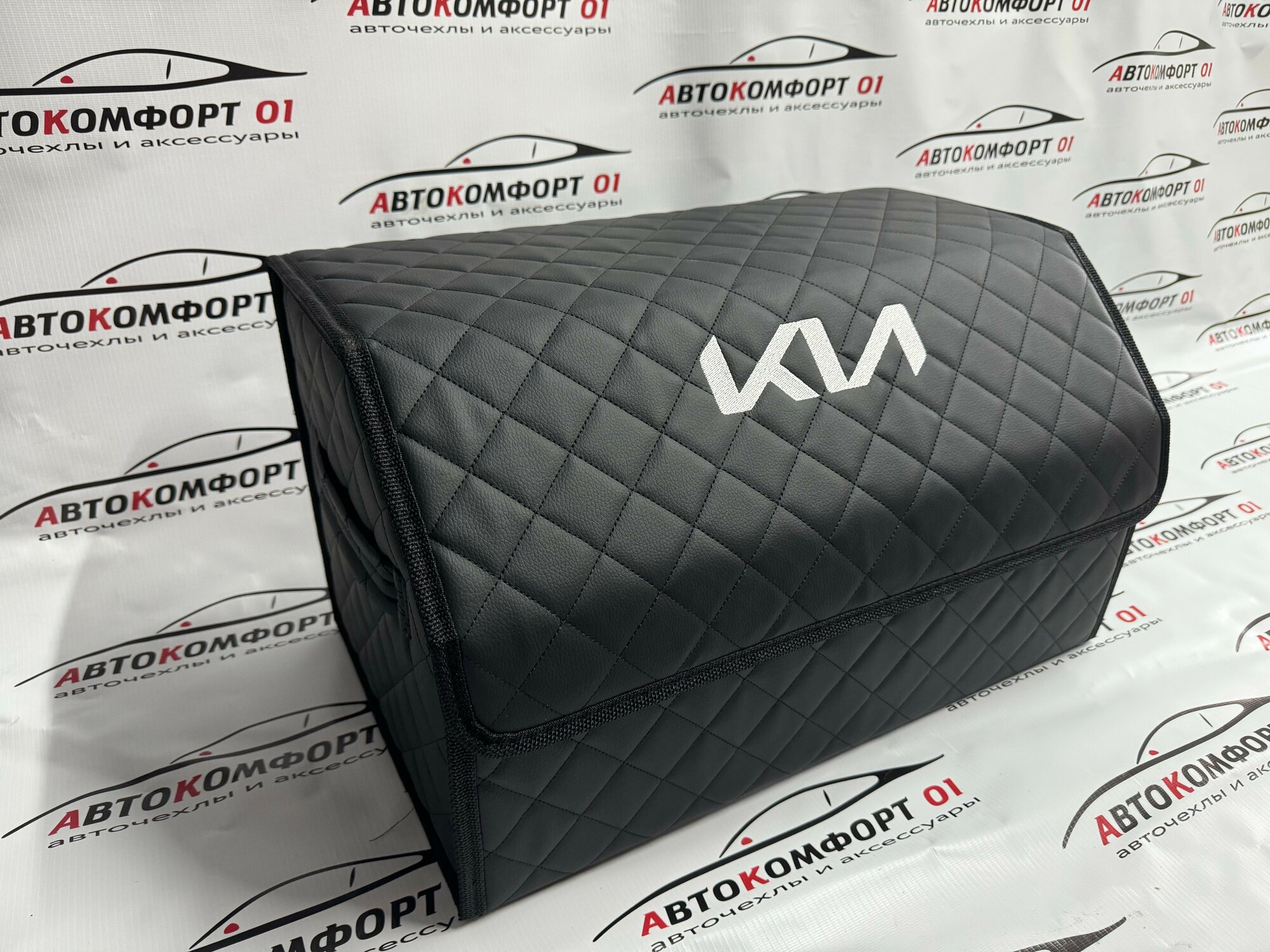 СохранитьОрганайзер в багажник с логотипом Kia (Киа) 50 см. Кожзам, ромб, черный. интересное: