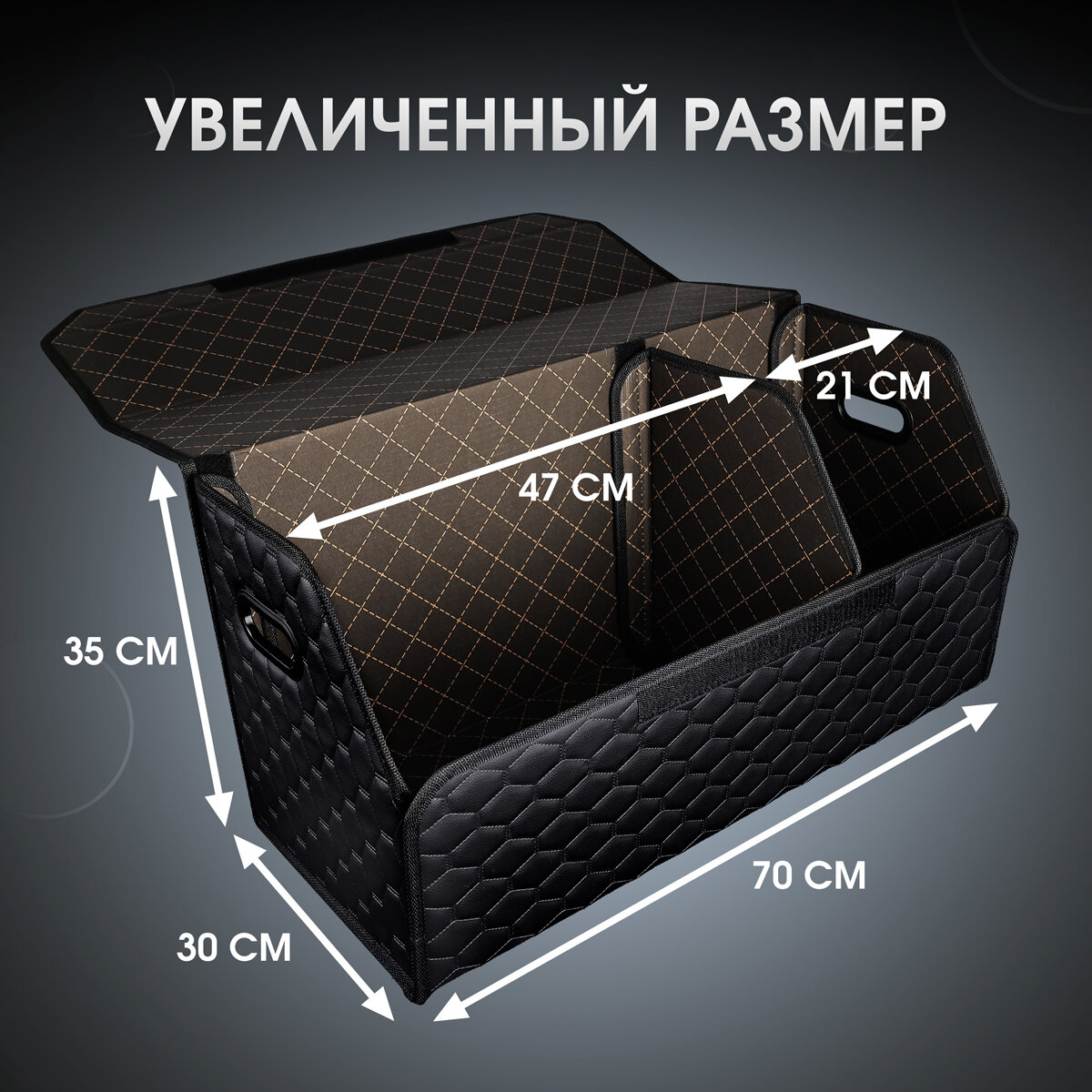 Органайзер в багажник автомобиля. Автомобильный аксессуар для хранения. Модель DIAMOND соты 70*35*30. Черный/бежевая строчка