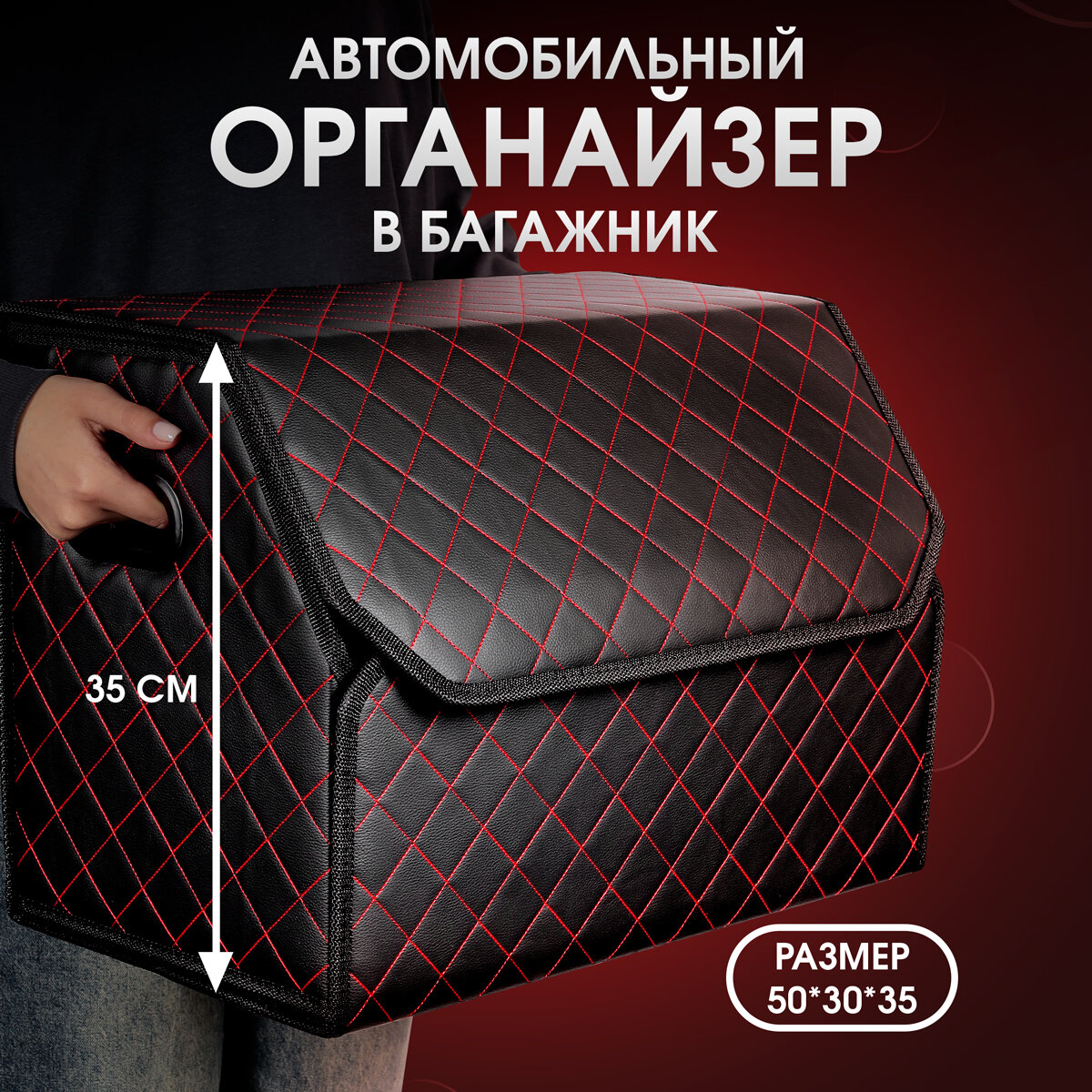 Купить Органайзер в багажник автомобиля. Бокс для хранения в авто 50*35*30. Чёрный/красная строчка