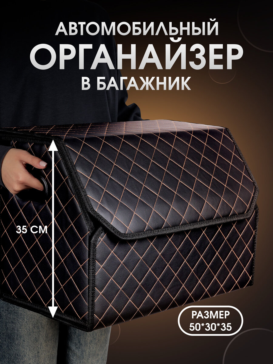 Купить Органайзер в багажник автомобиля. Бокс для хранения в авто 50*35*30. Чёрный/бежевая строчка