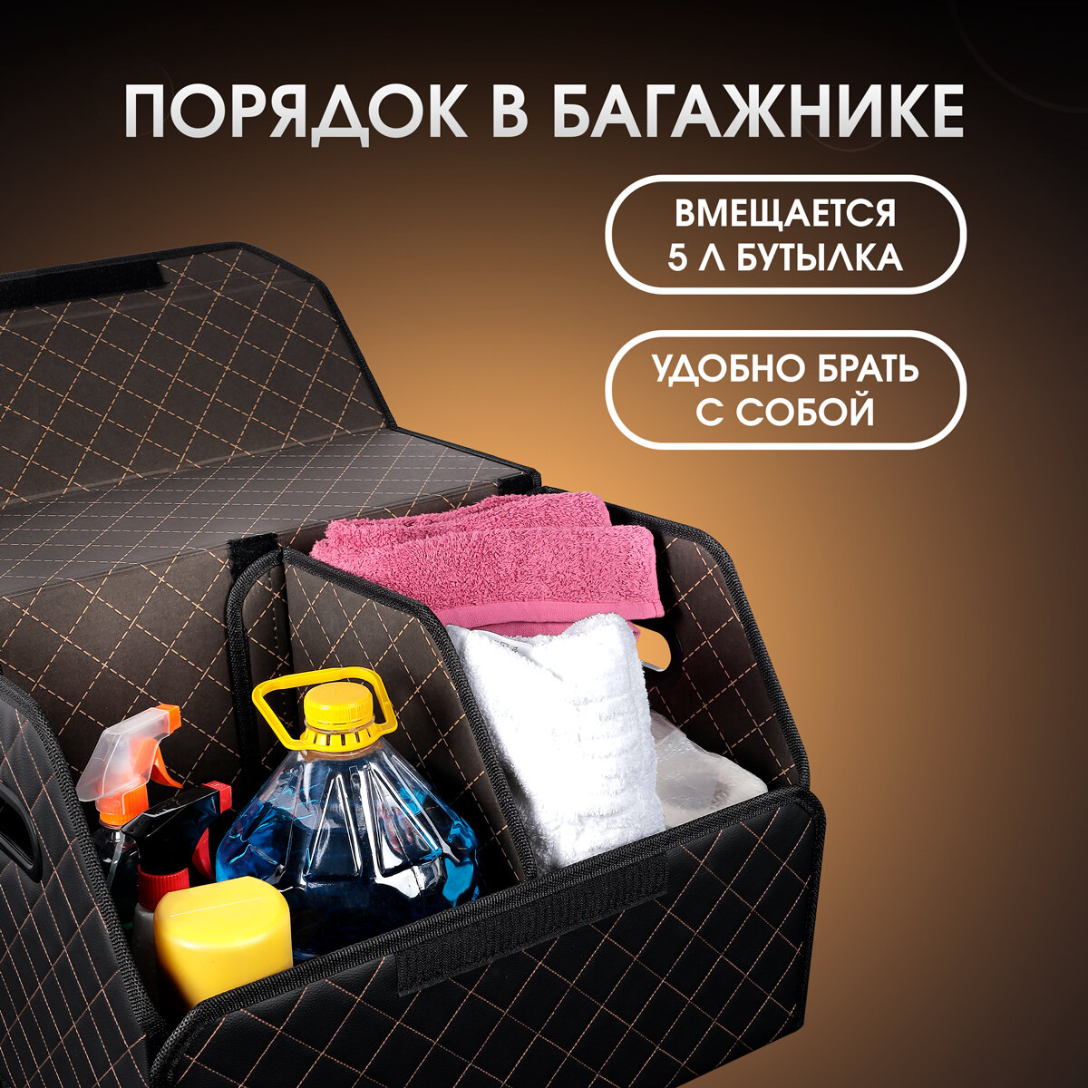СохранитьОрганайзер в багажник автомобиля. Бокс для хранения в авто 50*35*30. Чёрный/бежевая строчка интересное: