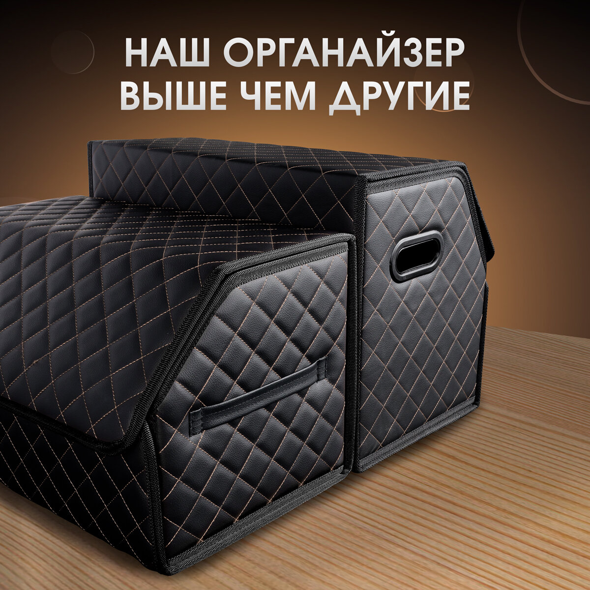 Органайзер в багажник автомобиля. Автомобильный аксессуар для хранения. Модель DIAMOND соты 70*35*30. Черный/бежевая строчка