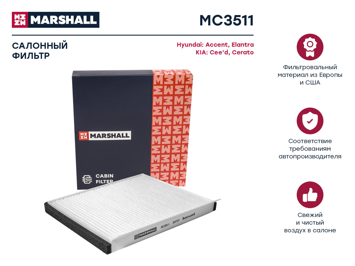 Купить Фильтр салонный Hyundai Accent III 05- Elantra IV-VI 05- Kia Cee'd II III 12- Cerato III 16- () Marshall MC3511