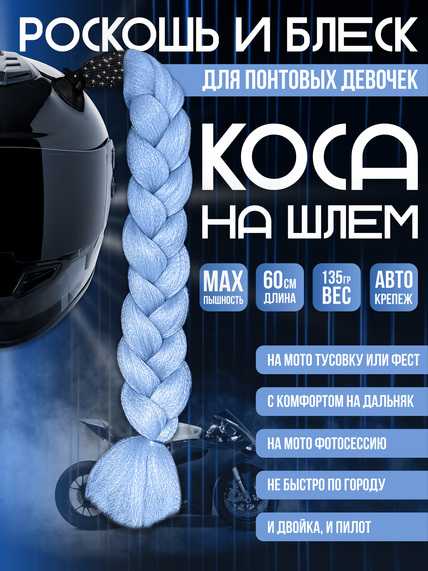 Купить Коса на шлем мото голубая от МОТОТОР, крепление на авто присоску