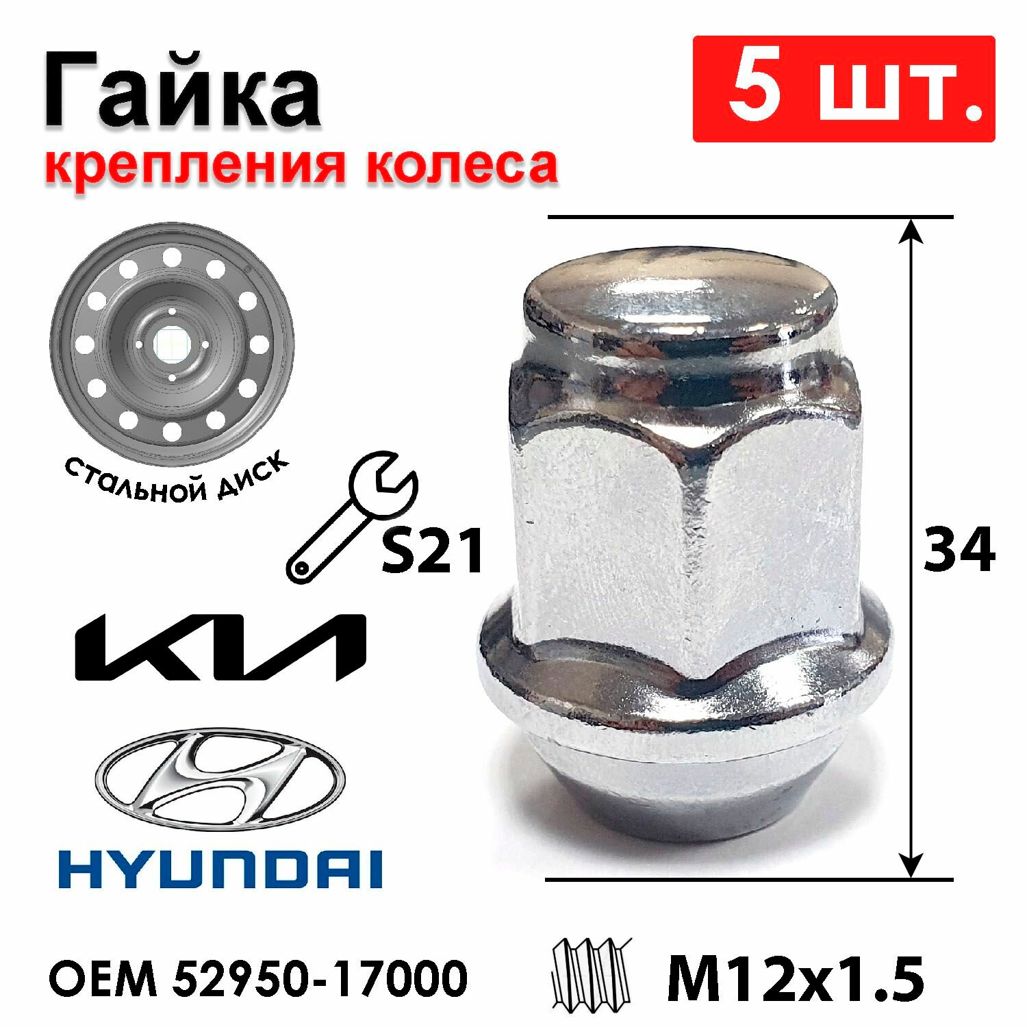 Гайки колесные Киа Рио, Хендай Солярис - стальной диск - М12*1.5*34 для авто марок / 5 шт. Hyundai и Kia OEM 52950-17000 интересное: