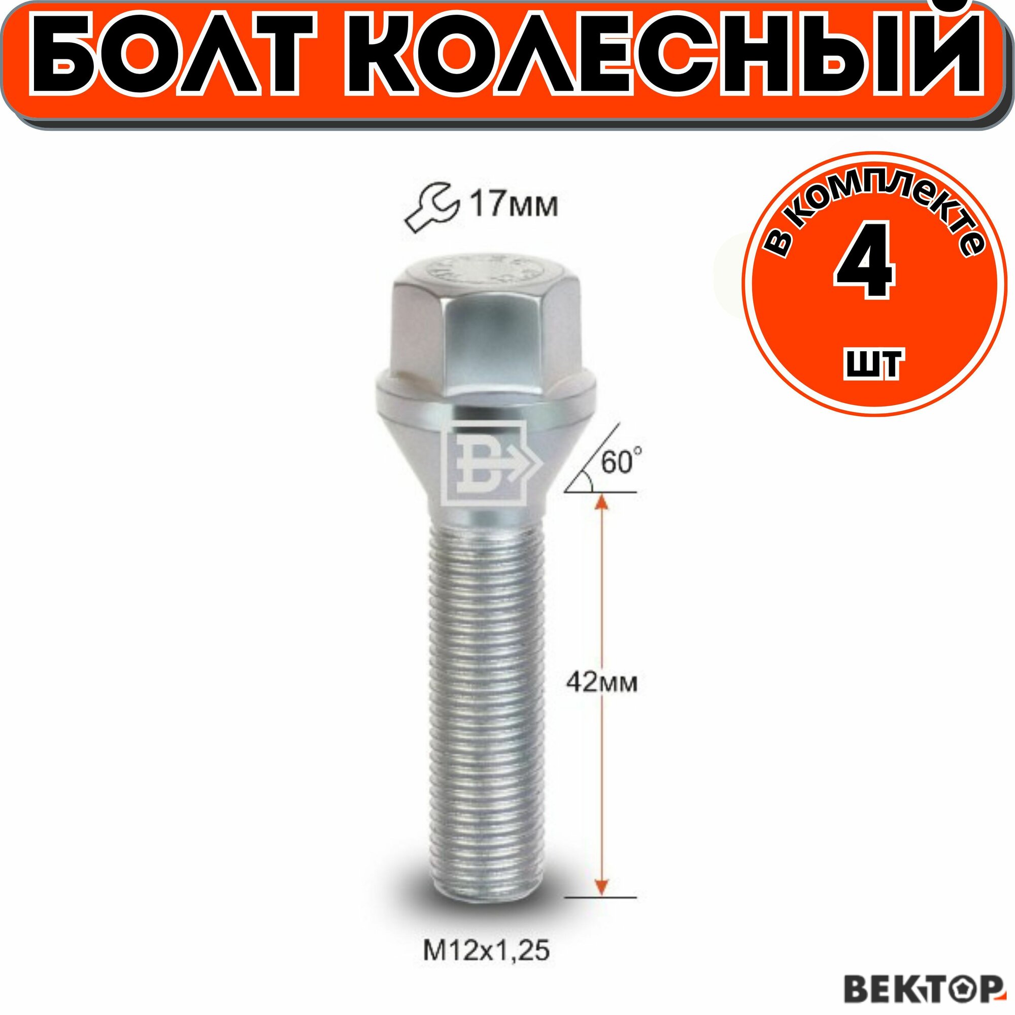 Болт колесный M12X1,25 42 Цинк Конус с выступом ключ 17 мм, 4 шт интересное: