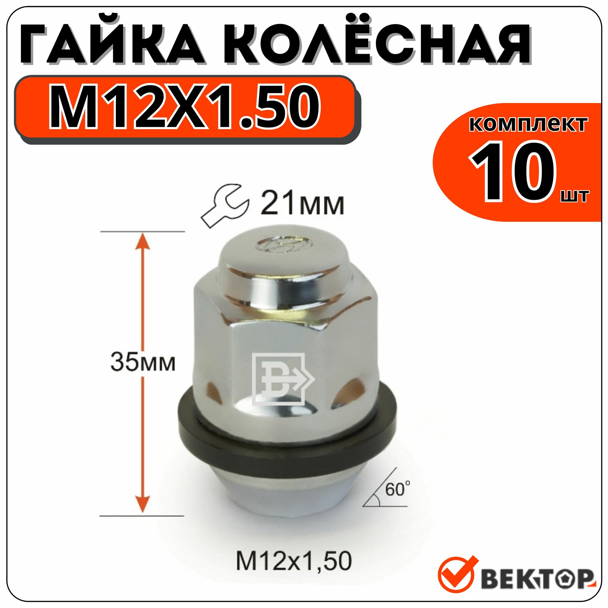 Гайка колесная M12X1,50 Хром, высота 35 мм, подходит на HYUNDAI, KIA, 10 шт интересное: