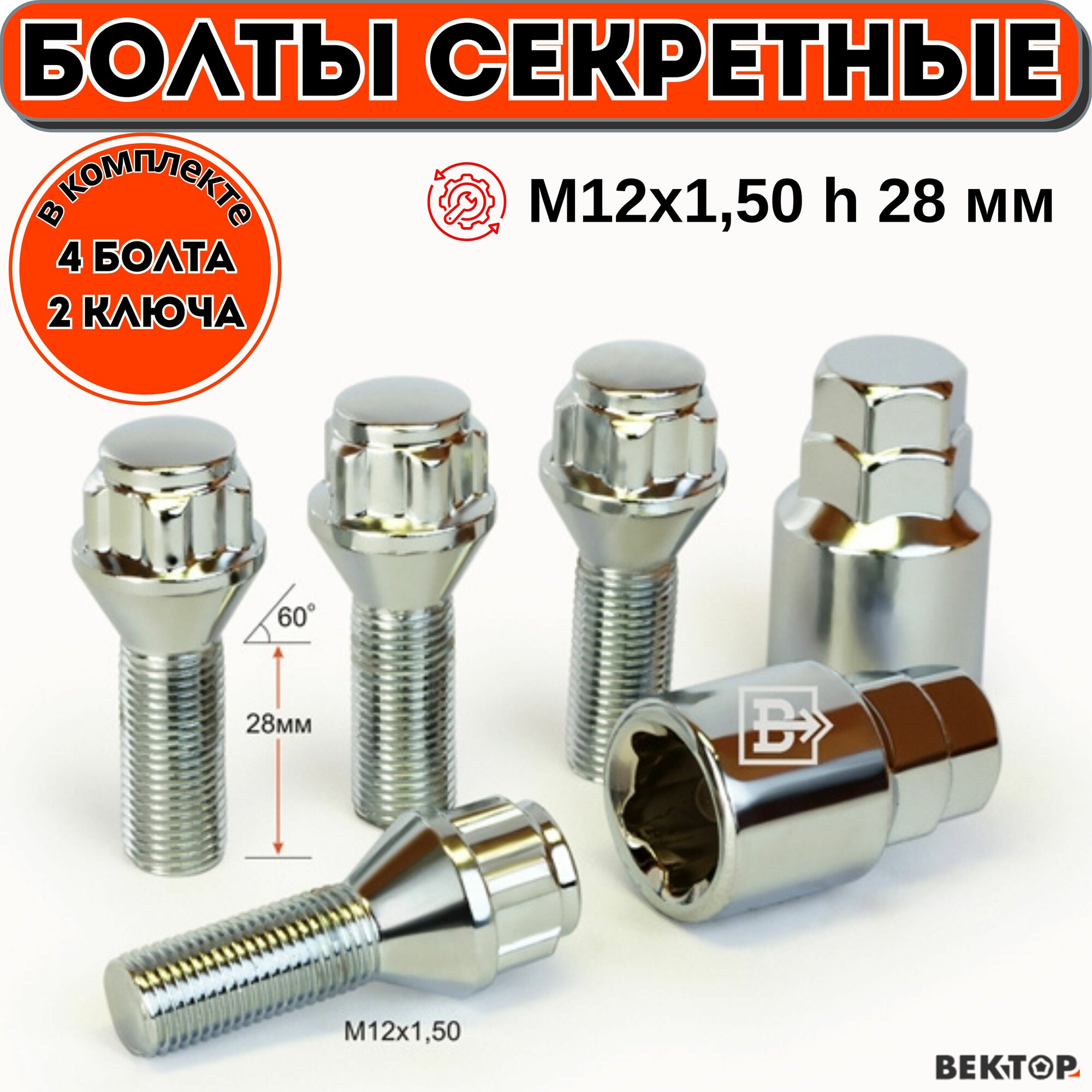 Болты секретки М12х1,50 28 мм, Конус, Хром, вектор (набор 4 болта+2 ключа) интересное: