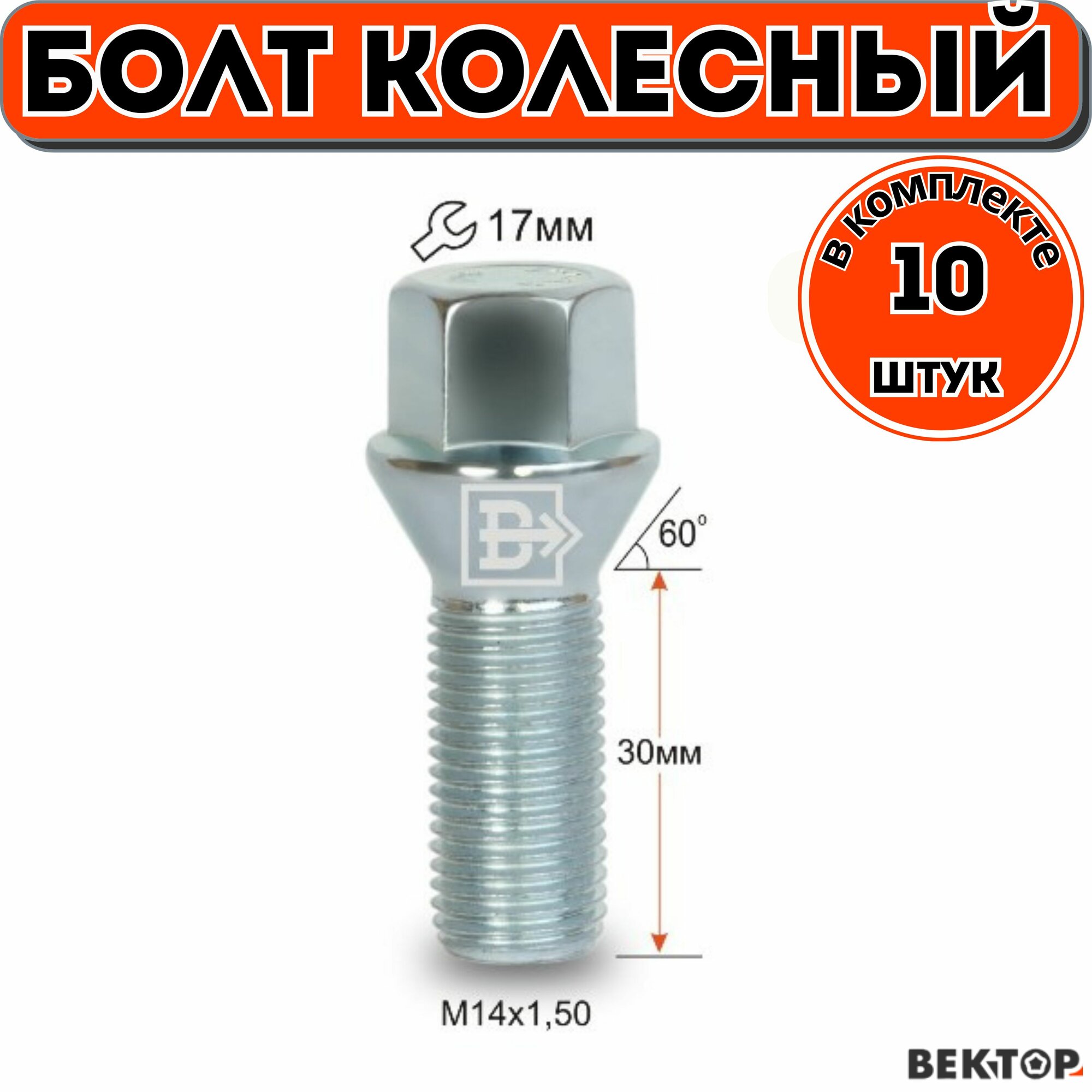 Болт колесный M14X1,50 30 мм Цинк Конус с выступом ключ 17 мм, 10 шт интересное: