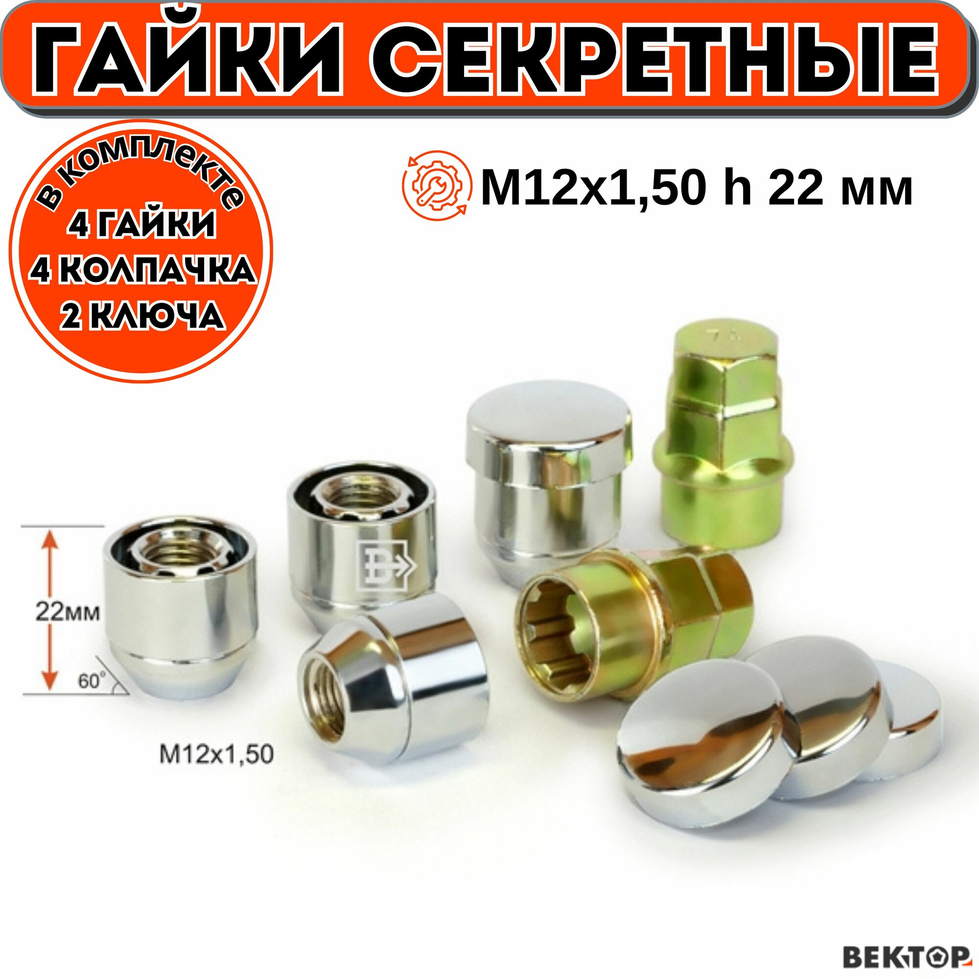 Гайки секретки М12х1,50 h 22 мм, Конус , Открытая, Хром, вектор (набор 4 гайки+2 ключа+4 колпачка) интересное: