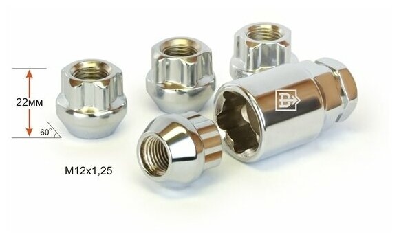 Гайки секретки М12х1,25 h 22 мм, Конус, Открытая, Хром, вектор (набор 4 гайки+1 ключ) интересное: