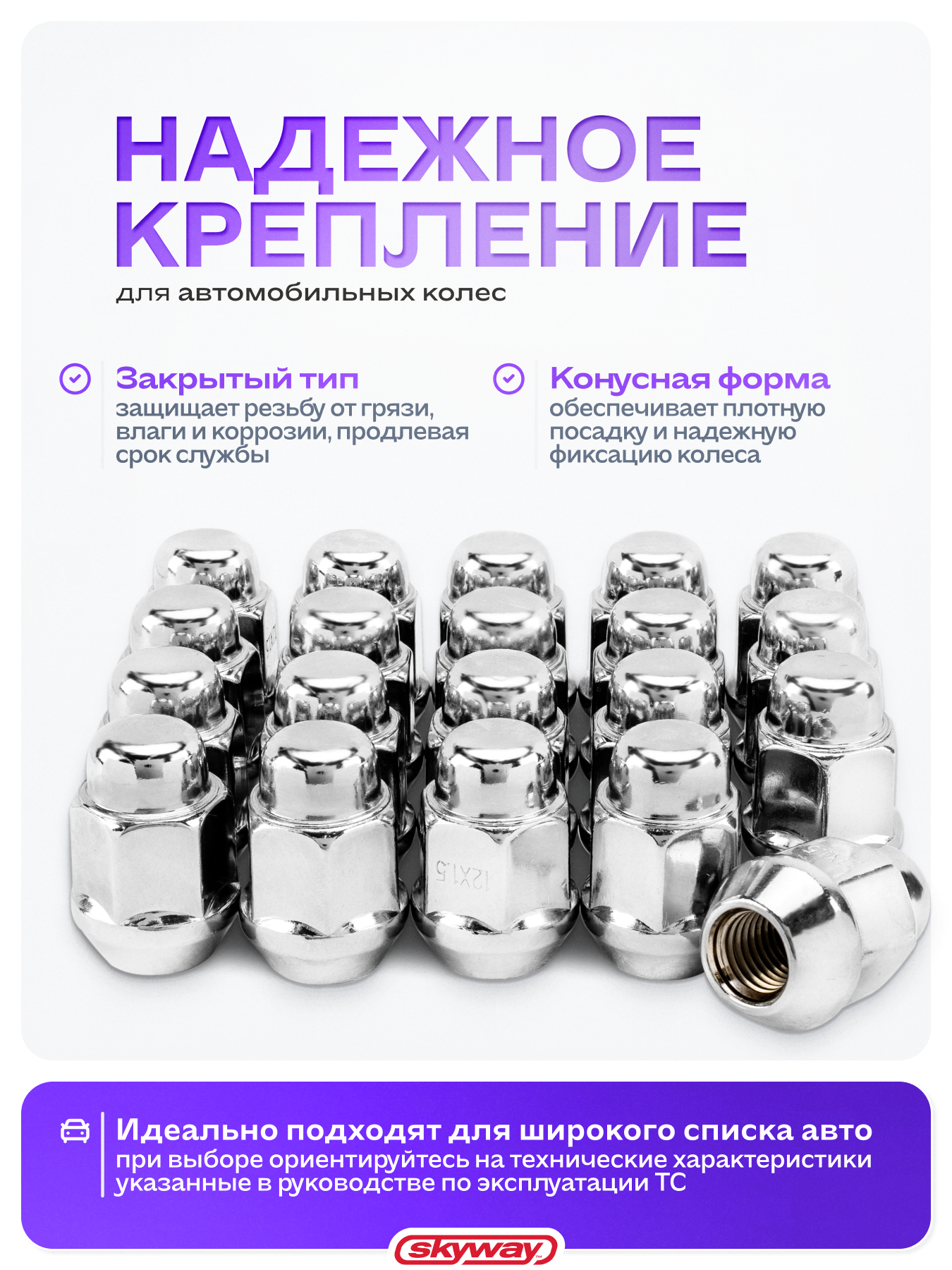 Купить Гайка конус M12х1,50 закрытая 35мм ключ 13/16"(21мм) хром SKYWAY 025 (в компл.20 шт), S10602025/K