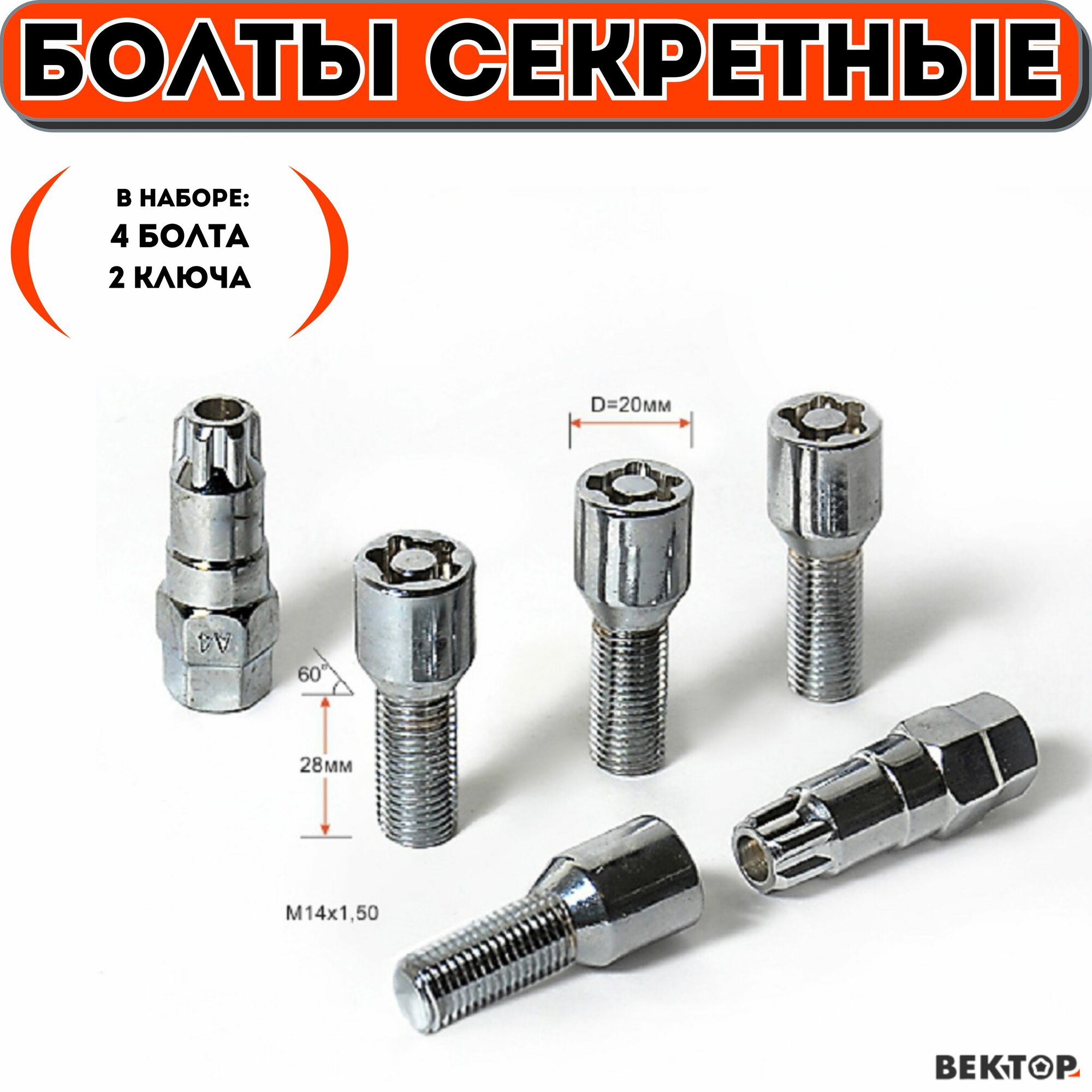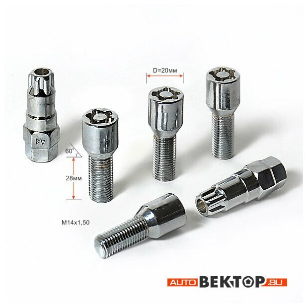 Болты секретки М14х1,50 L 28 мм, Конус, Хром, вектор (набор 4 болта+2 ключа) интересное: