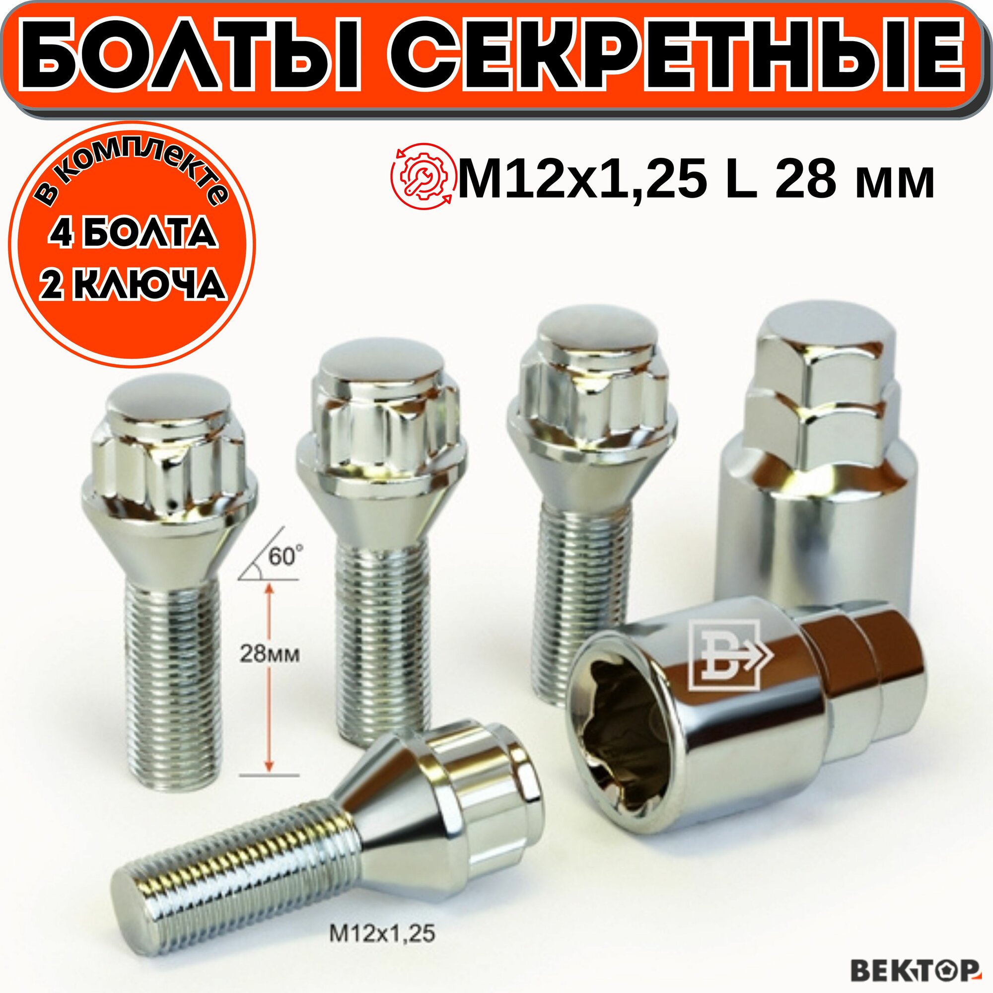 Болты секретки М12х1,25 L 28 мм, Конус, Хром, вектор (набор 4 болта+2 ключа ) интересное: