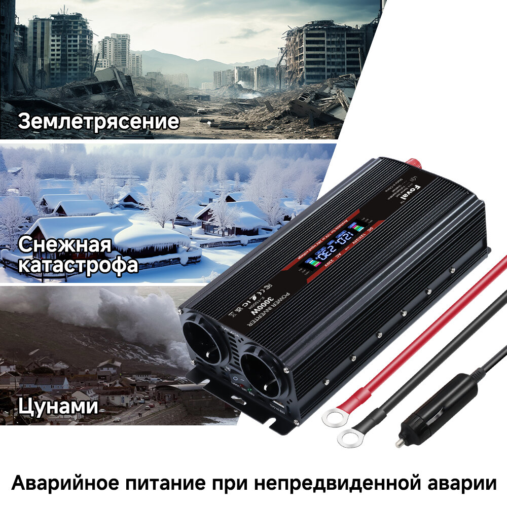 Автомобильный инвертор 3000W, преобразовательное напряжение 12V - 220V, с интерфейсом 2USB, розетка ЕС, ЖК-индикатор интересное: