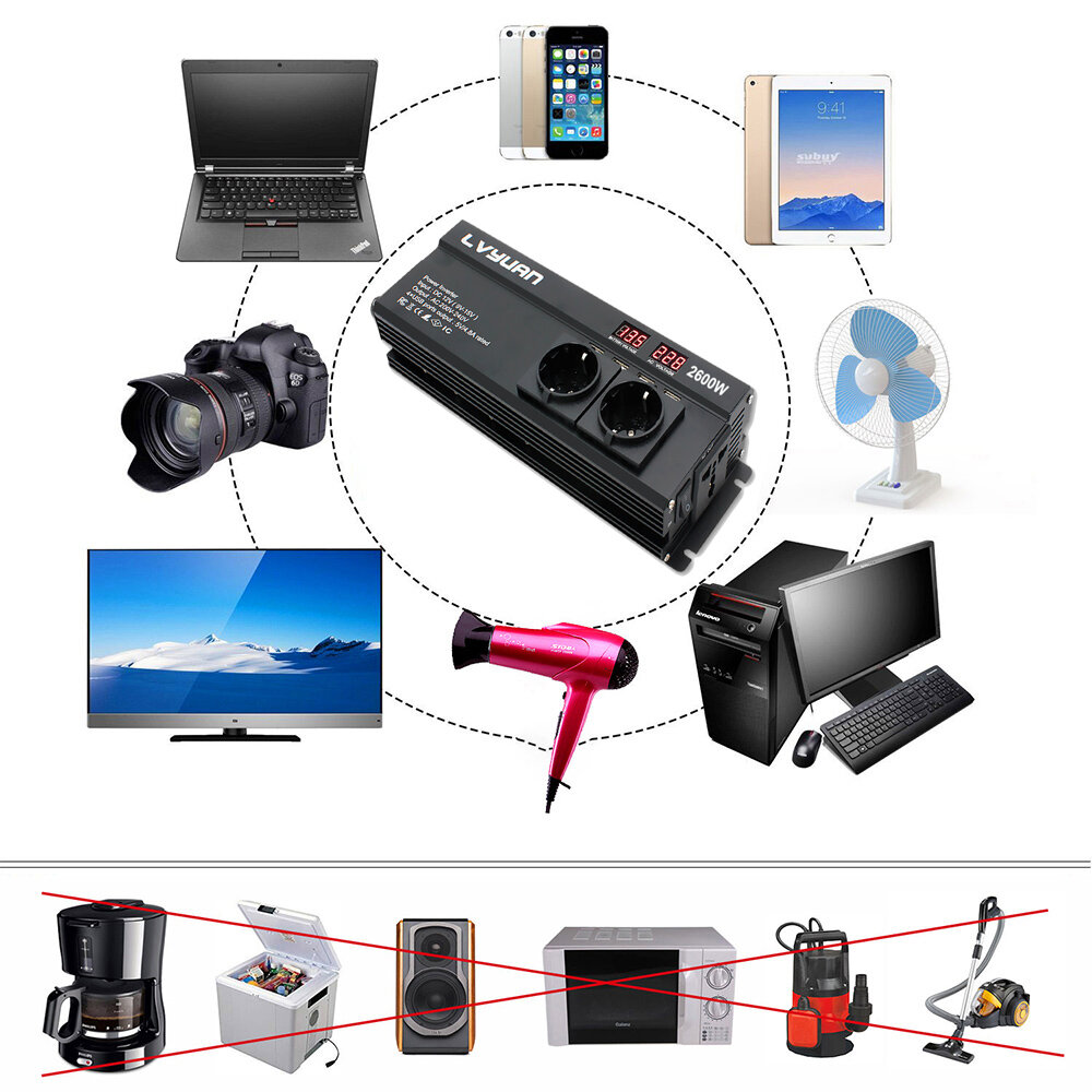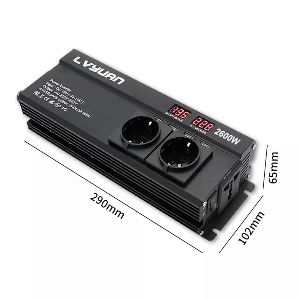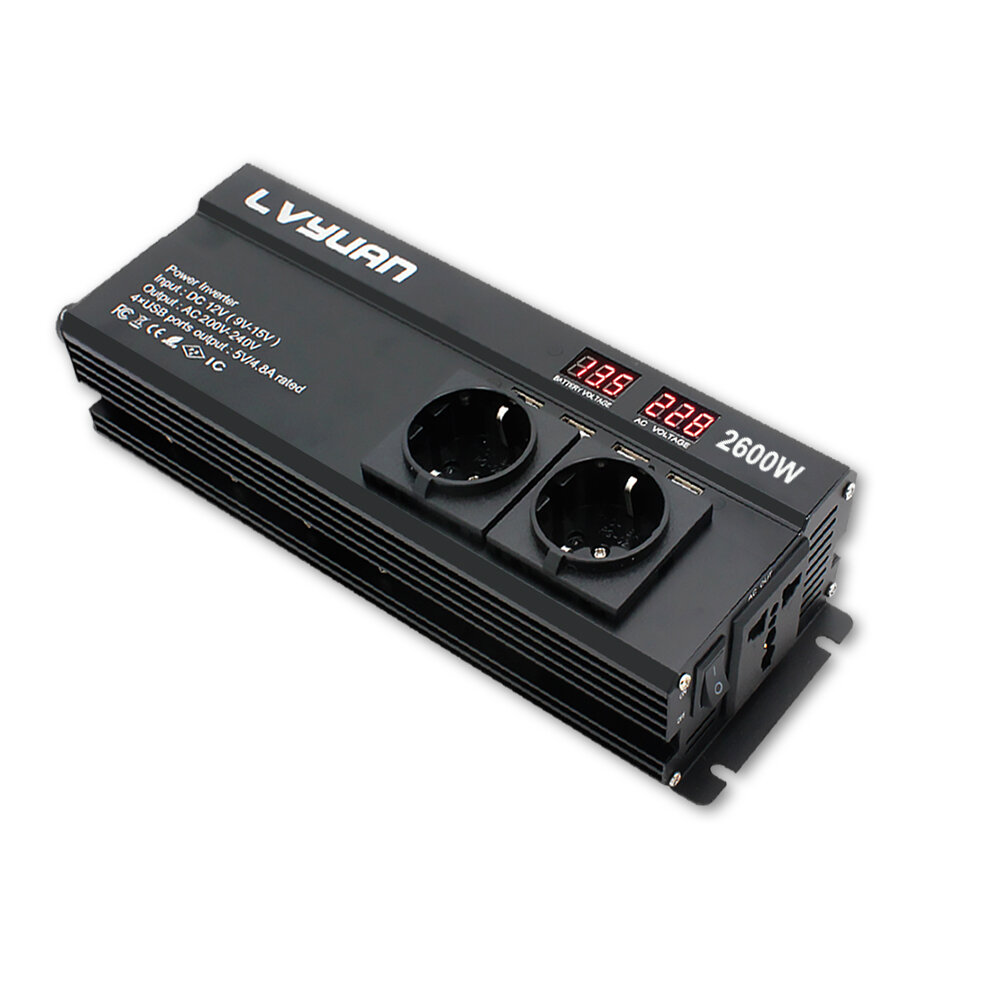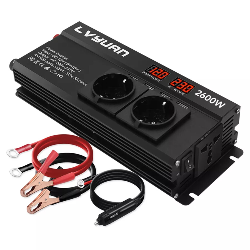 Lvyuan Автомобильный инвертор, преобразователь напряжения, 2600Вт, 12-220 В, с разъёмом 4USB, две розетки ЕС интересное:
