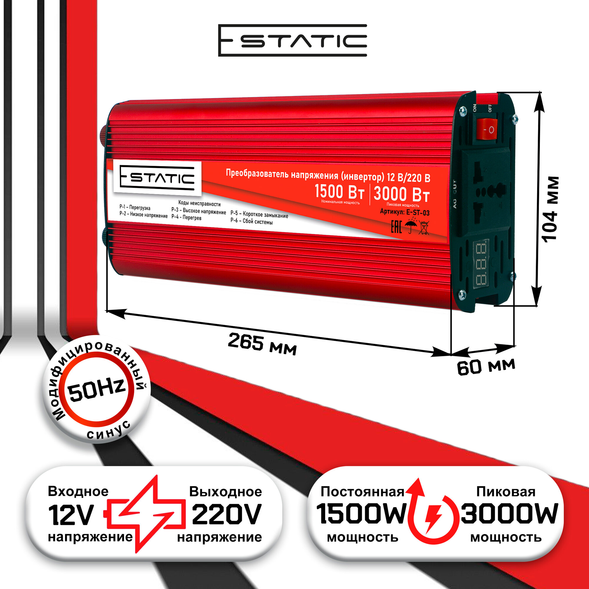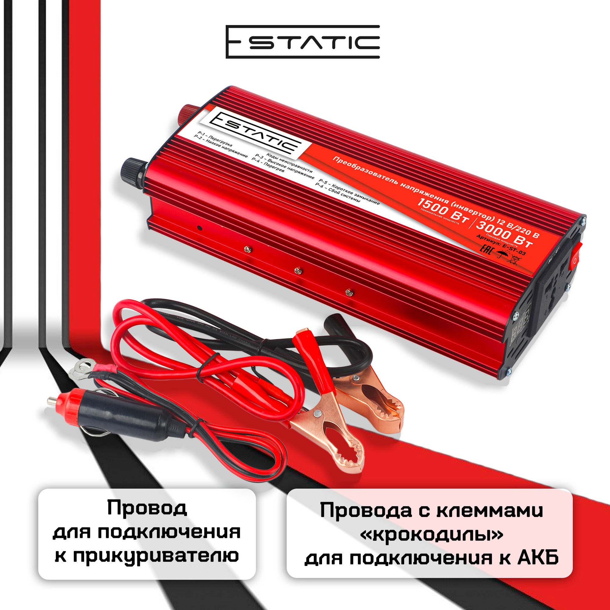 Купить Инвертор автомобильный 12-220 В, тм E-Static, 3000 Вт (постоянная нагрузка до 1500 Вт), цифровой дисплей