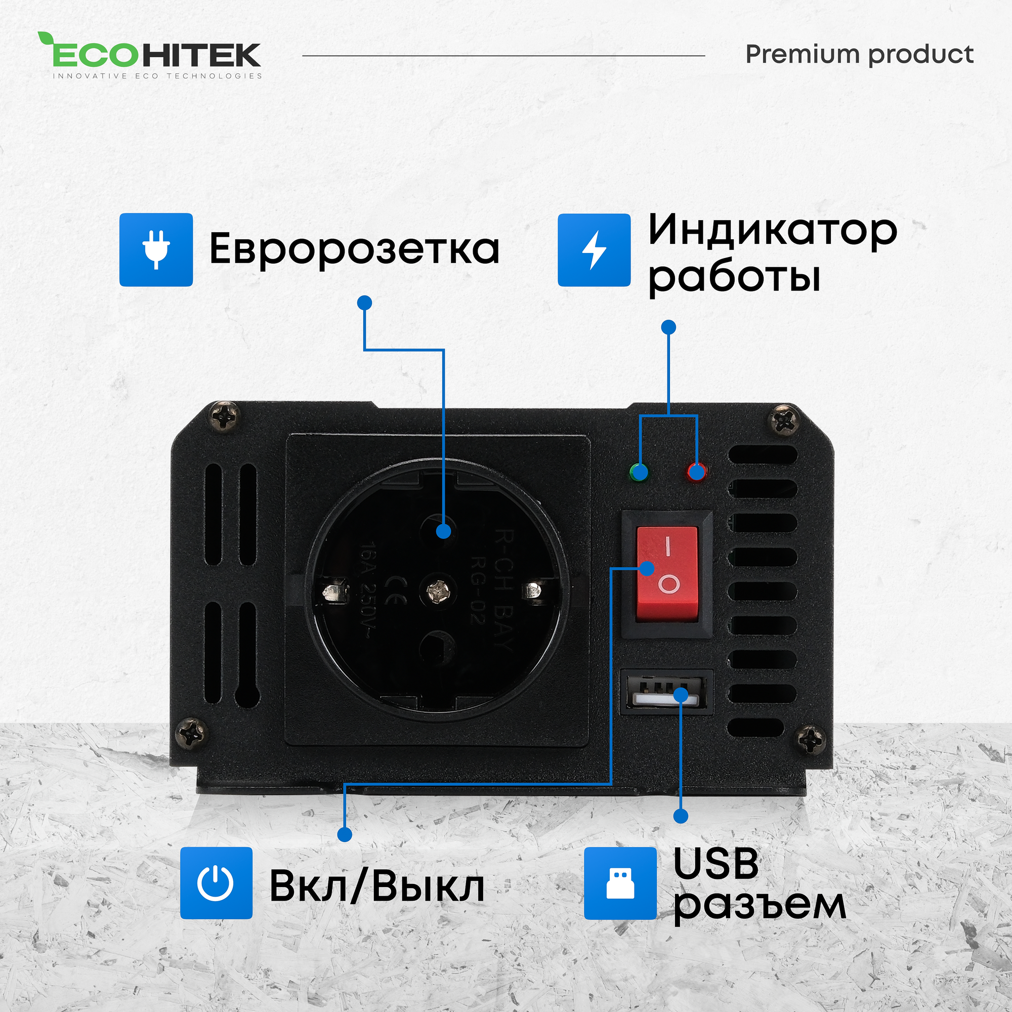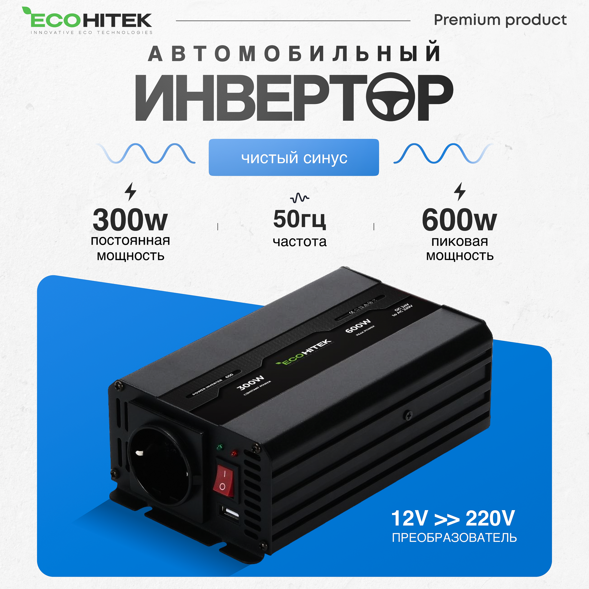 Купить Инвертор автомобильный 12 220, 600Вт от EcoHitek. (пост нагрузка до 300 Вт). Чистый синус. Подключение приборов, эл. инструмента, котла отопления