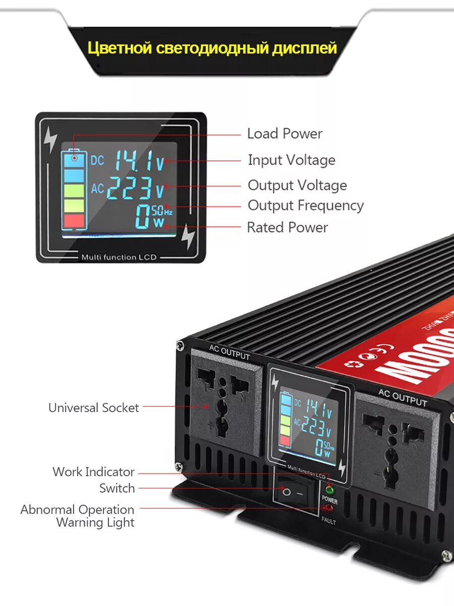 Автомобильный инвертор 3000W, 12В-220В, чистая синусоида, двойной выход RDDSPON, солнечная энергия. Аварийное питание
