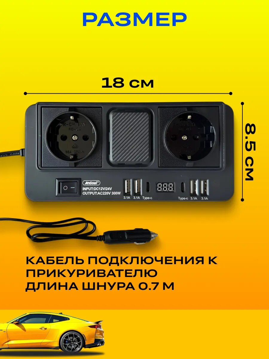 Автомобильный инвертор напряжения Andowl-300W, 12В-220В, USBx4 порта, TYPE-Cx2 порта интересное: