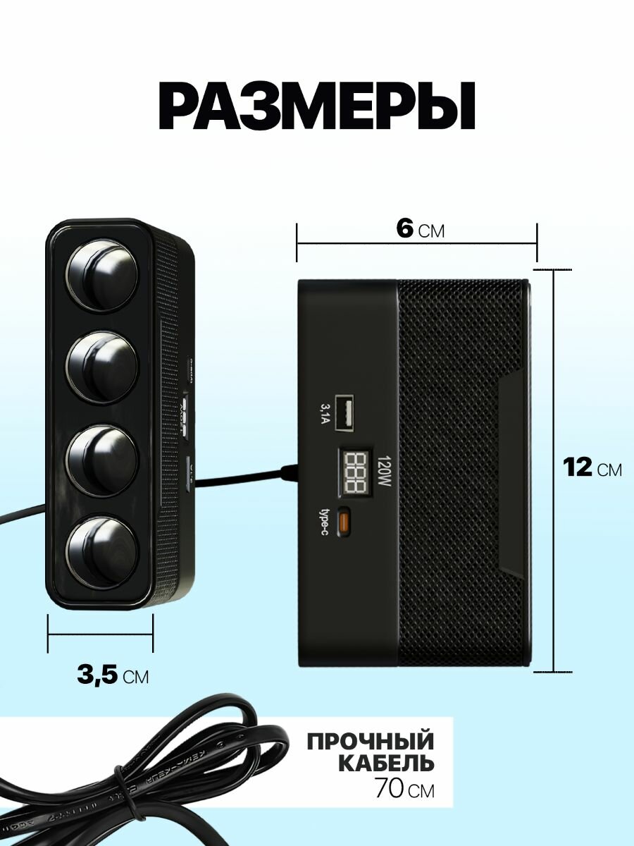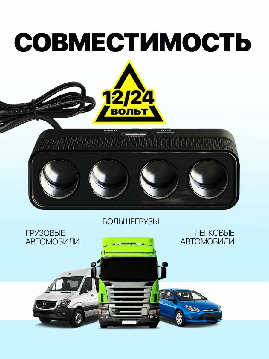 Разветвитель в машину на 4 гнезда прикуривателя, type-c 2014 608 для авто, черный интересное: