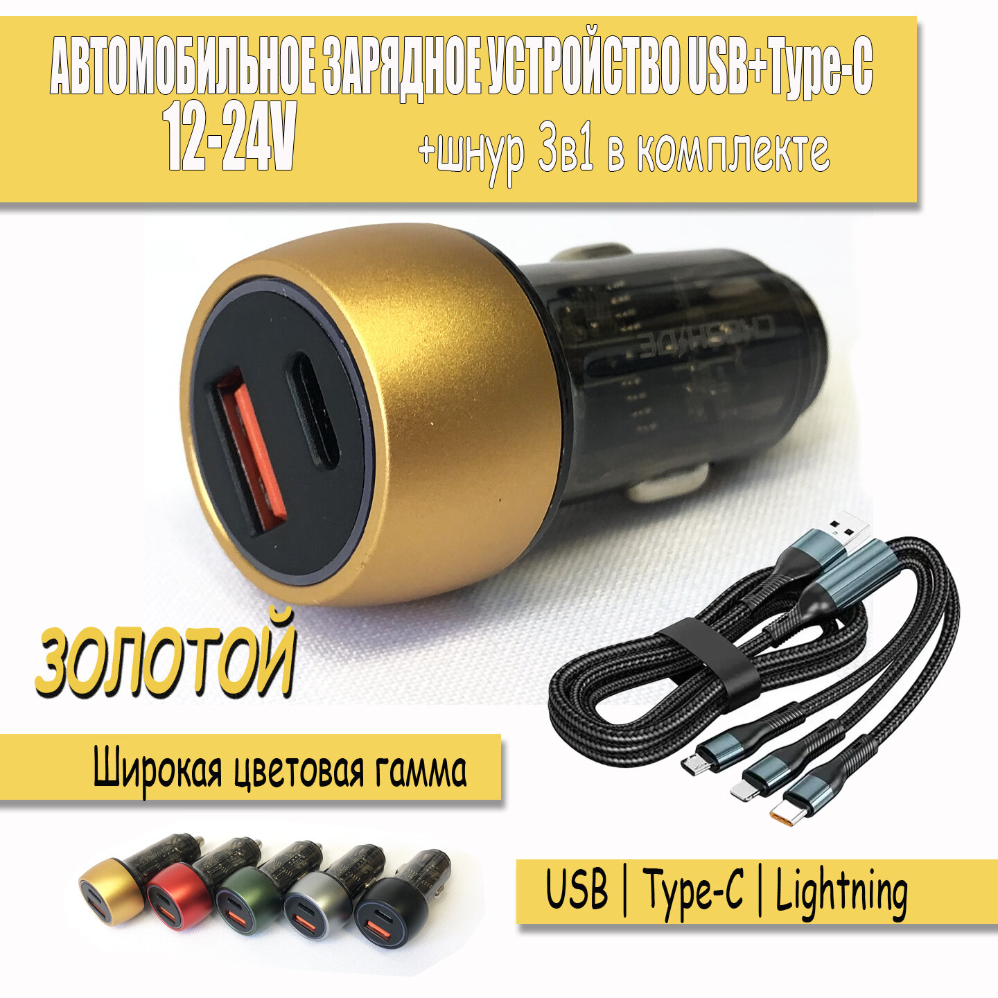 Купить Разветвитель прикуривателя 12-24вольт PD7775 USB+Type-C автомобильная зарядка, шнур 3в1 в комплекте, золотистый