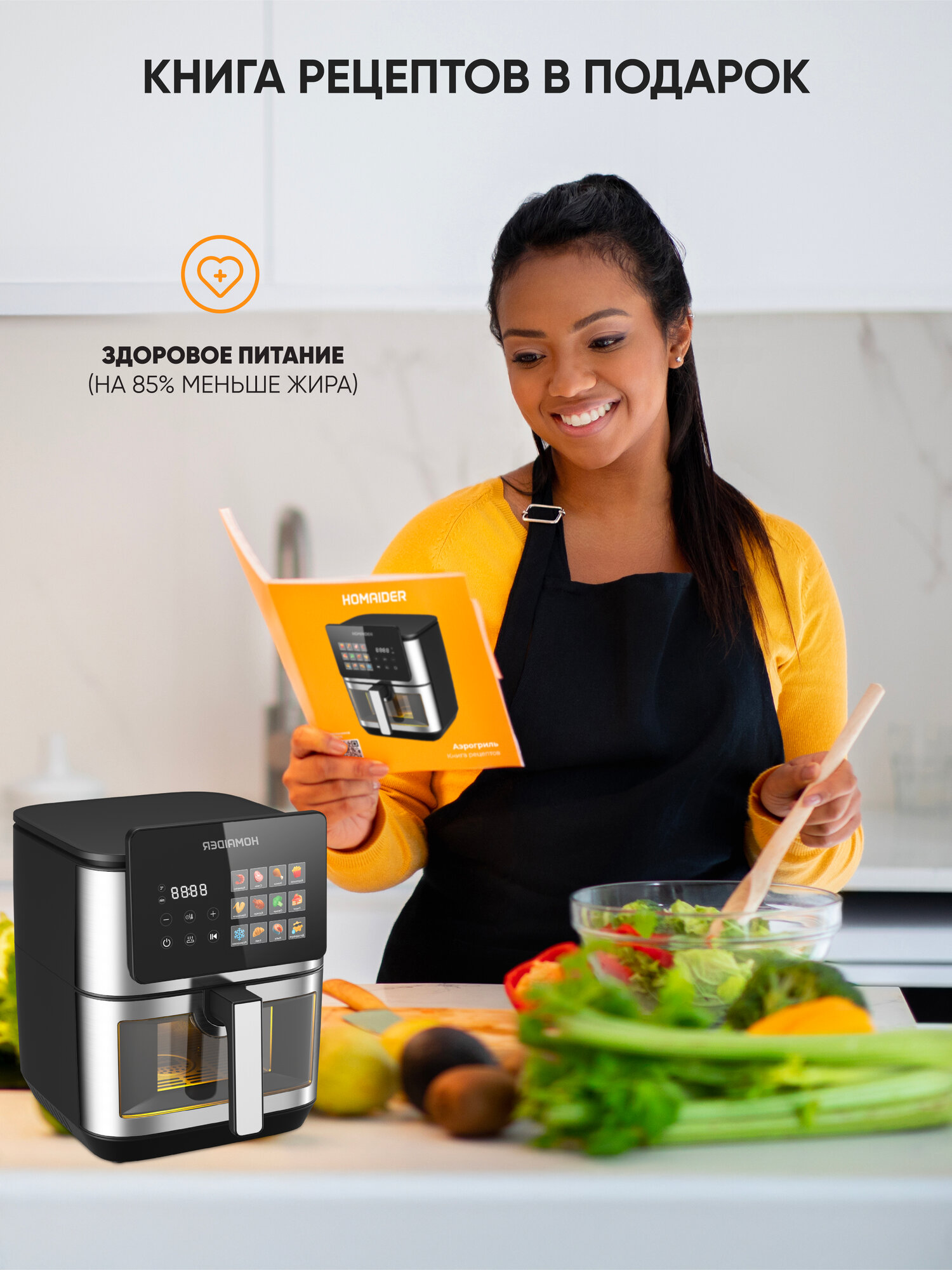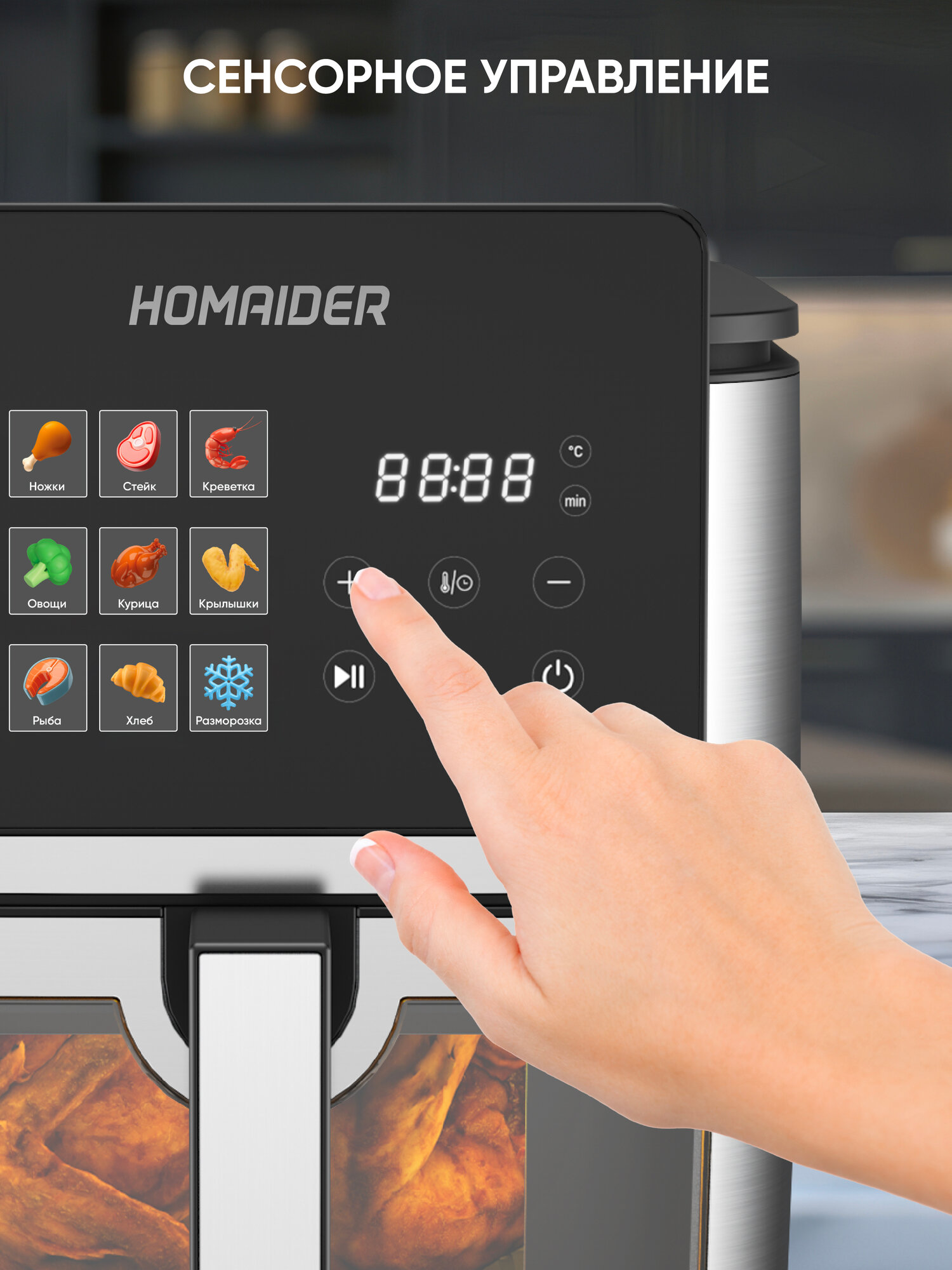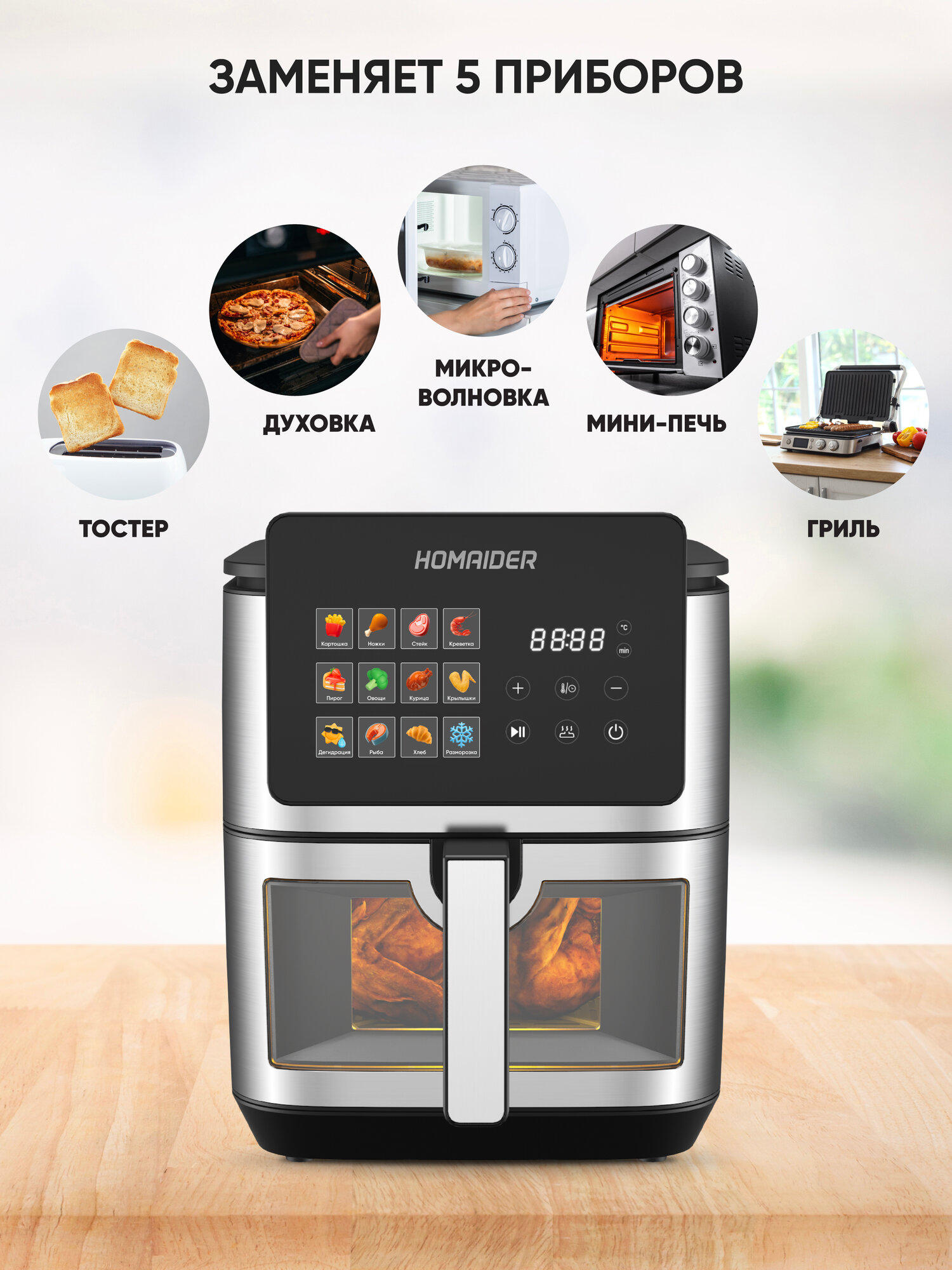 Аэрогриль электрический Homaider, антипригарное покрытие, 12 программ, сенсорное управление, 9л, черный, 2100 Вт интересное: