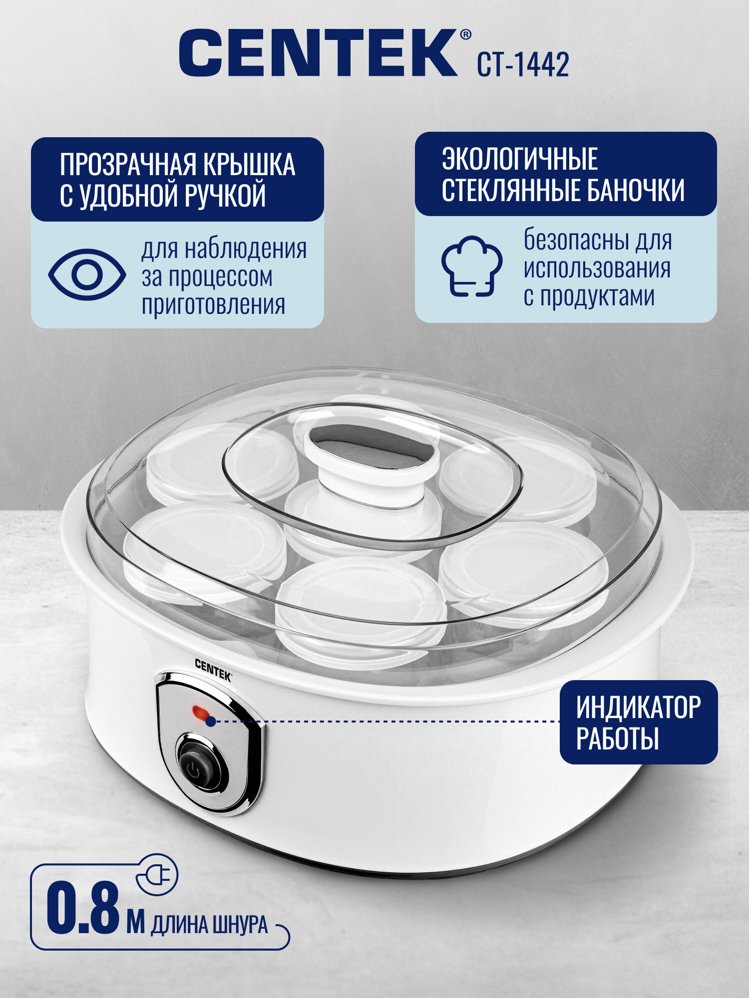 Купить Йогуртница CENTEK CT-1442 White, 7 стекл. баночек, прозрачная крышка.