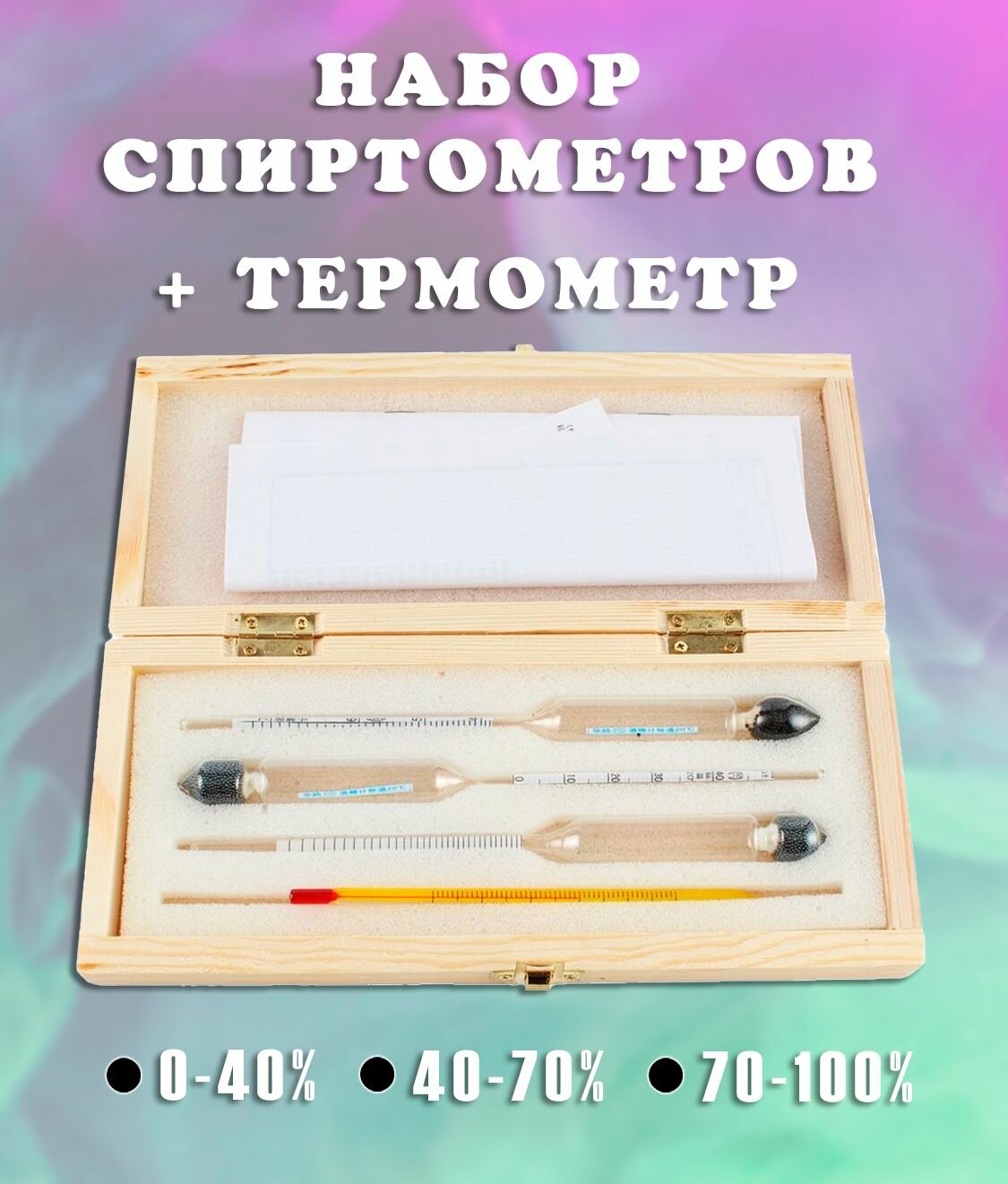 Набор спиртометров АСП-3 с термометром (ареометры 0-40, 40-70, 70-100) в деревянном кейсе АМ-193 интересное: