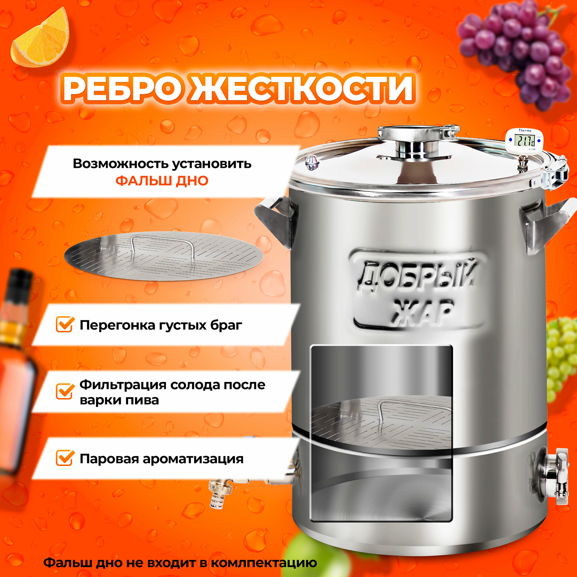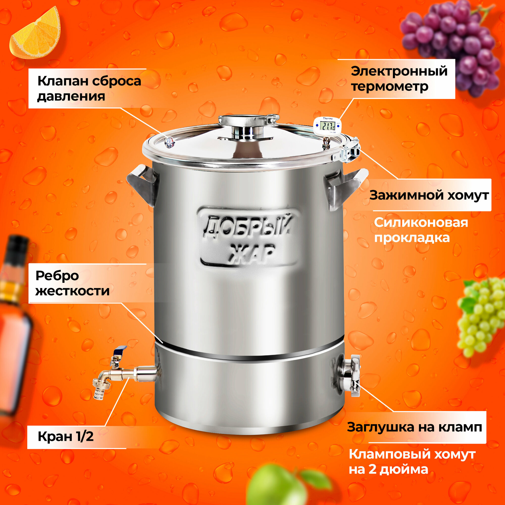 Ниже Вы можете прочитать отзывы на Перегонный куб "Добрый жар" 30 литров с ТЭН, крышка с клампом на 2 дюйма, ознакомится с подробными характеристиками, посмотреть интересные обзоры и фотографии на Перегонный куб "Добрый жар" 30 литров с ТЭН, крышка с клампом на 2 дюйма.