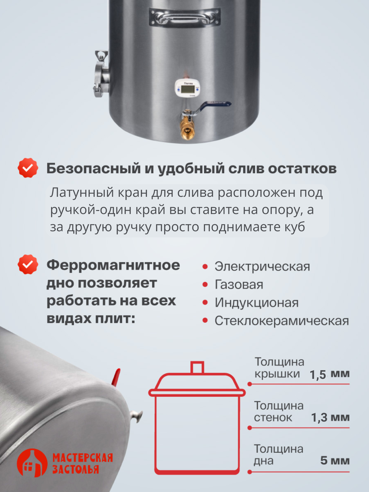 Перегонный куб 37 литров с конусной крышкой, кламп 1,5”, дно 5мм Мастерская застолья интересное: