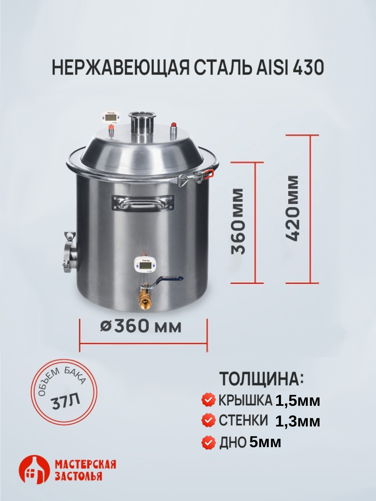Купить Перегонный куб 37 литров с конусной крышкой, кламп 1,5”, дно 5мм Мастерская застолья