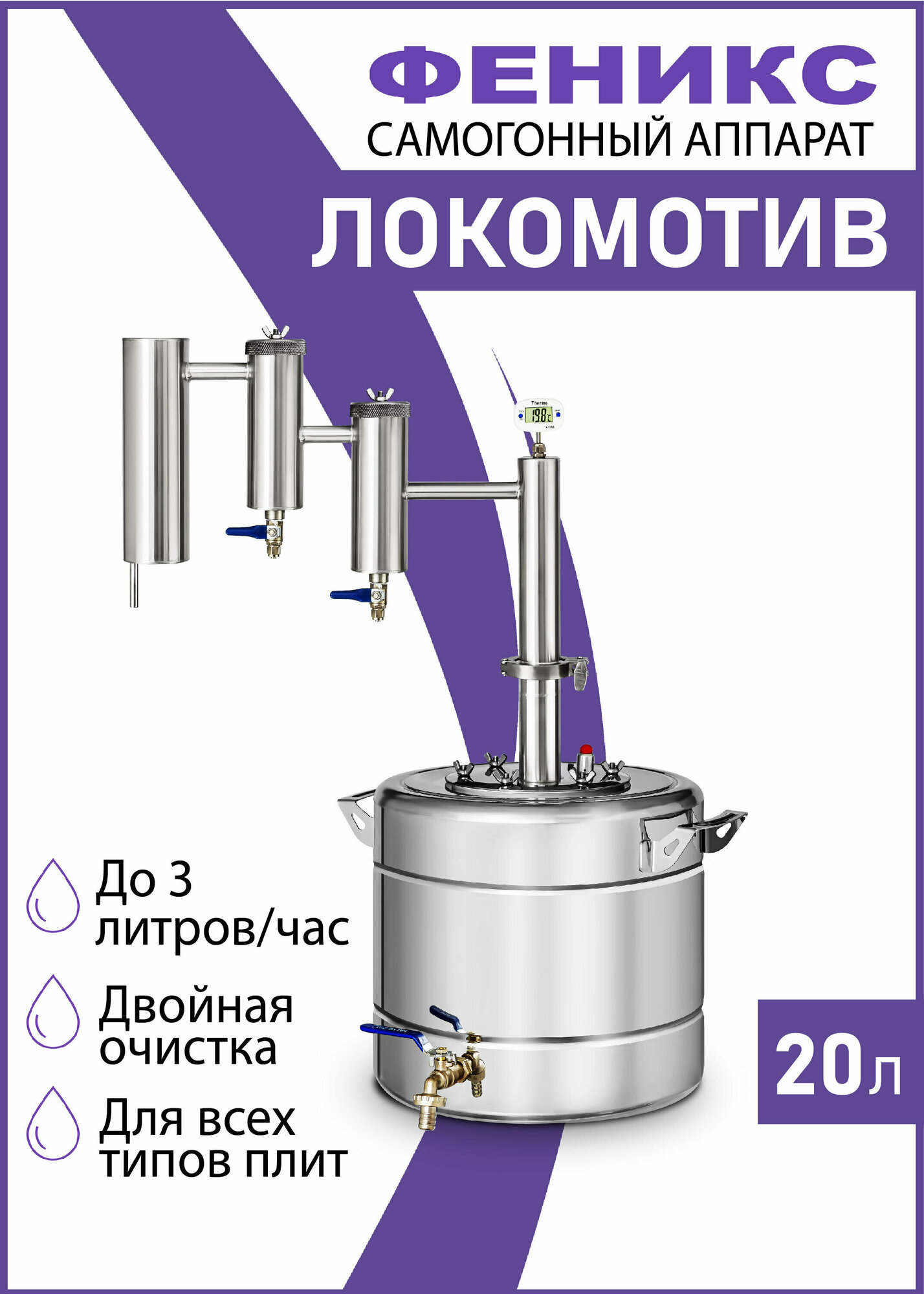 Локомотив - самогонный аппарат Феникс с двумя сухопарниками, 20 литров, дистиллятор для самогона интересное: