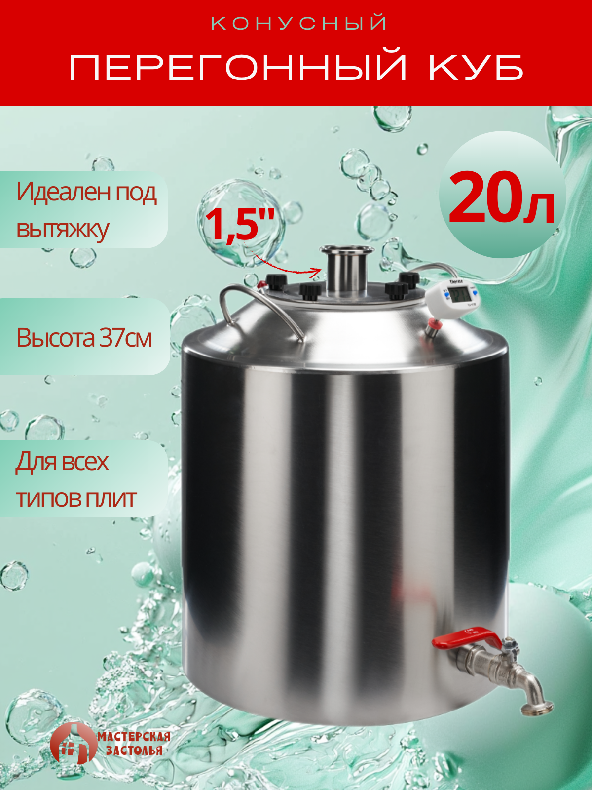 Перегонный куб 20 литров, невысокий, конусный, кламп 2 дюйма Мастерская застолья