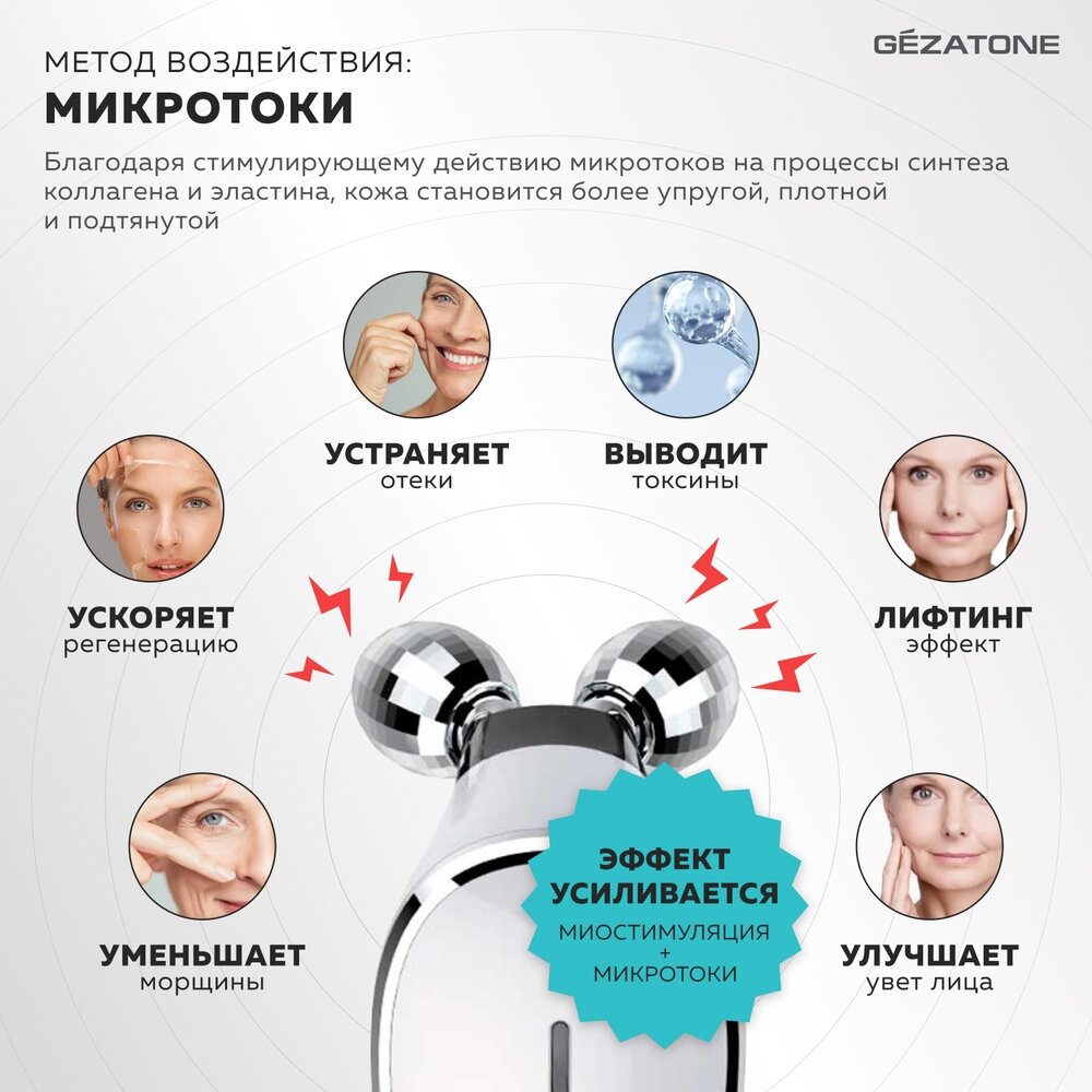 Купить Массажер для лица, с микротоками, миостимуляцией, вращение, аккумулятор, 2 насадки
