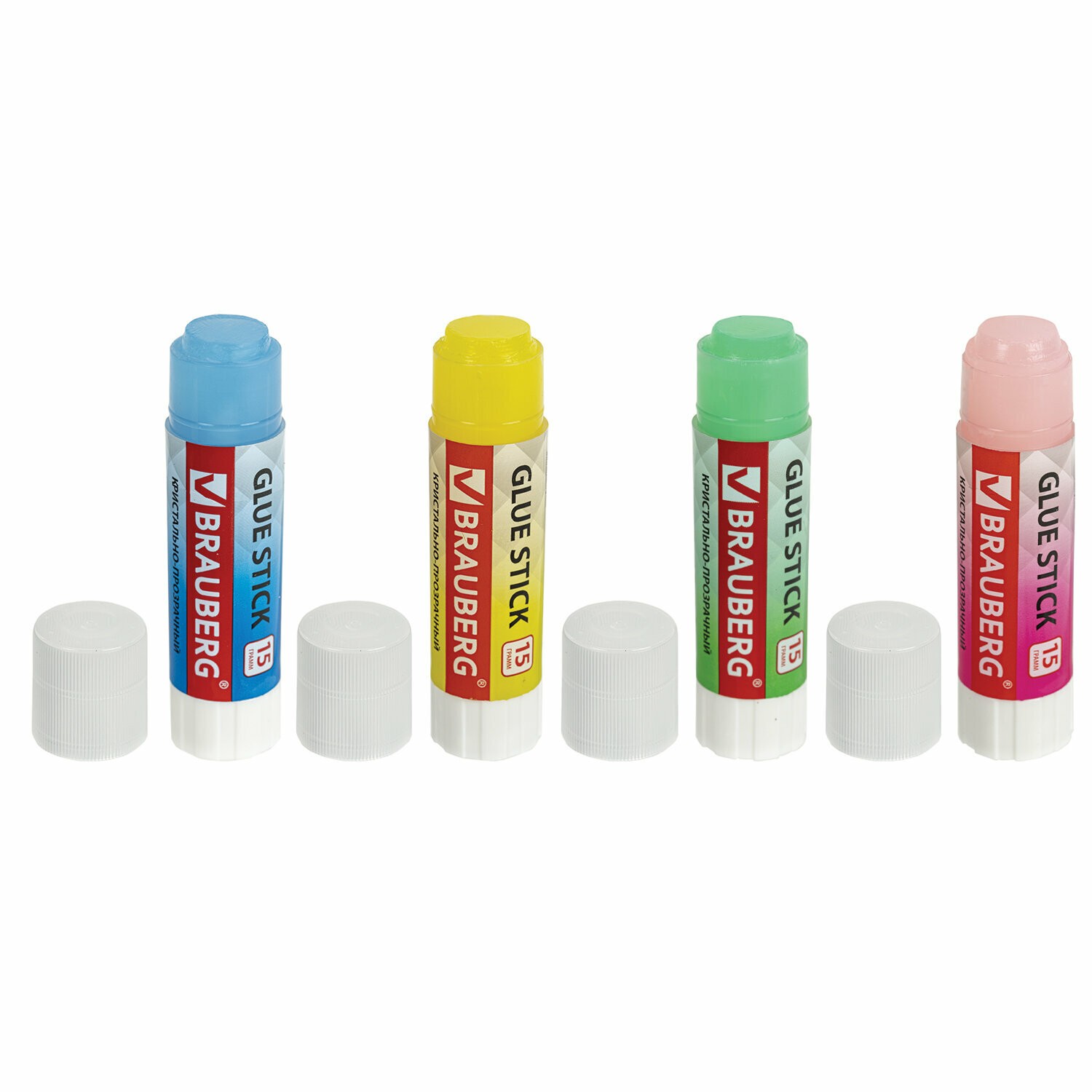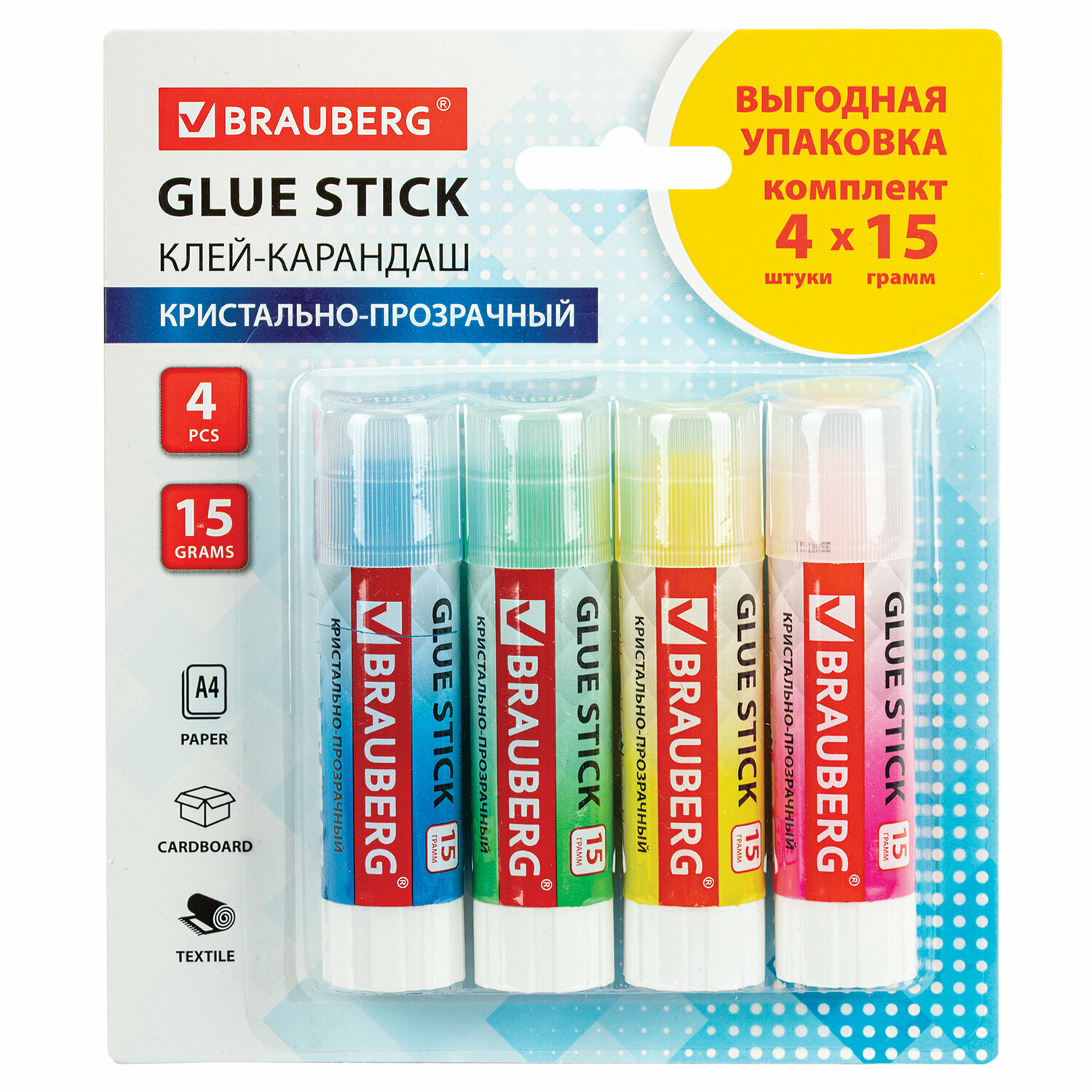 Купить Клей карандаш канцелярский для бумаги и картона 15 г выгодная упаковка BRAUBERG "COLOR Crystal", 4 штуки на блистере, 271709