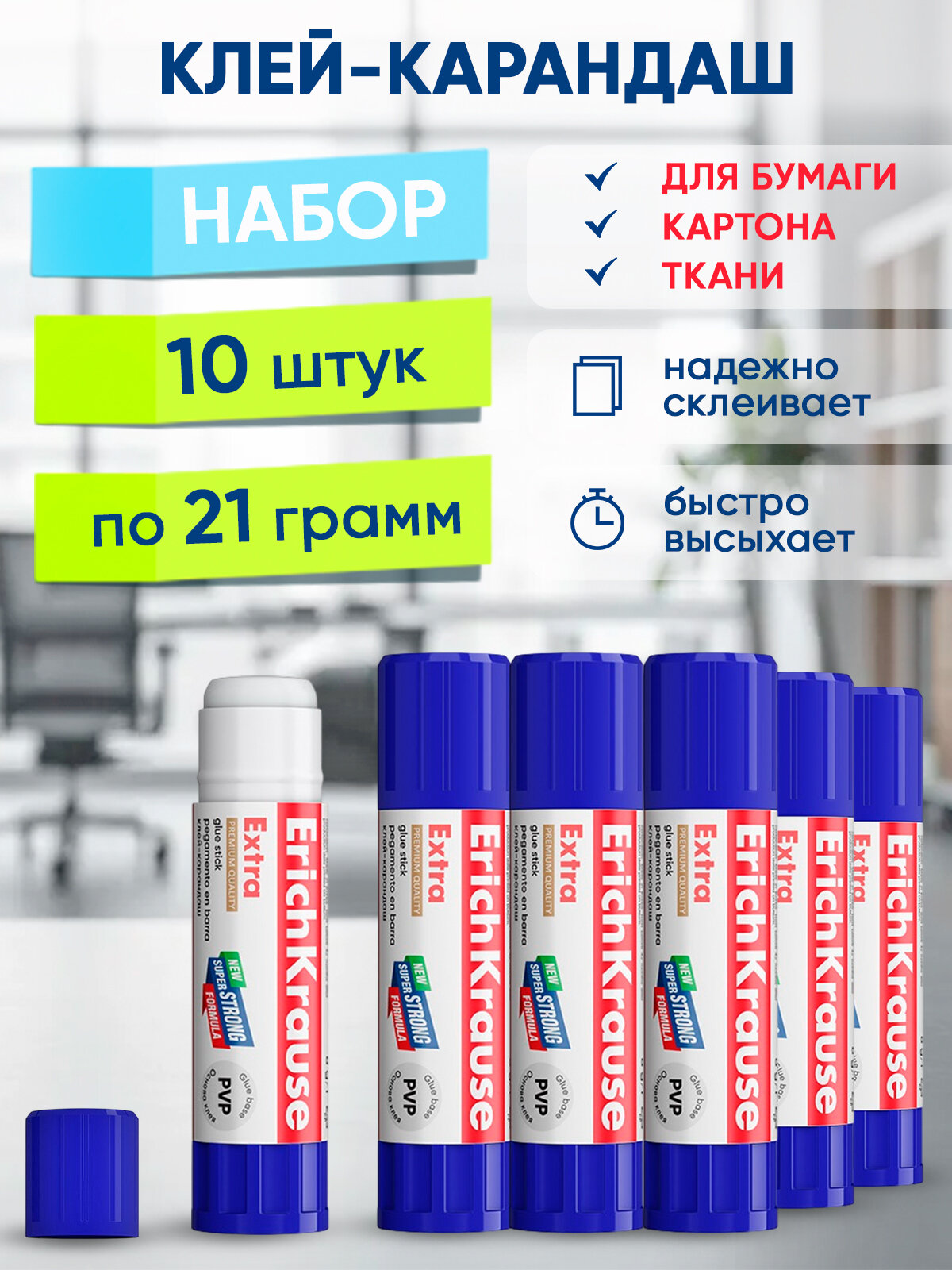 Клей-карандаш "Extra" ErichKrause, без дозатора 21 гр, 10 шт