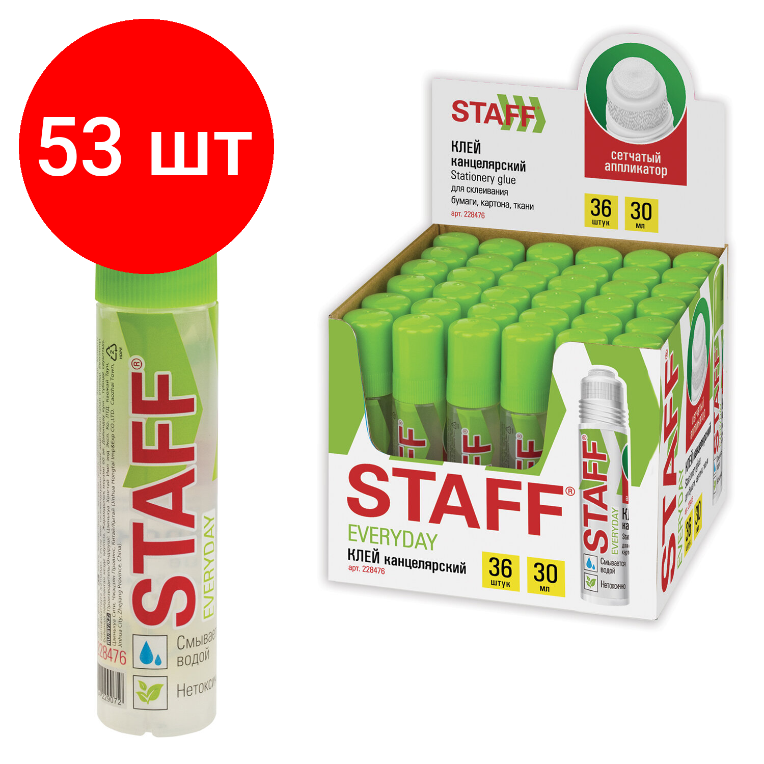 Купить Комплект 53 шт, Клей канцелярский STAFF EVERYDAY 30 мл, сетчатый аппликатор, 228476