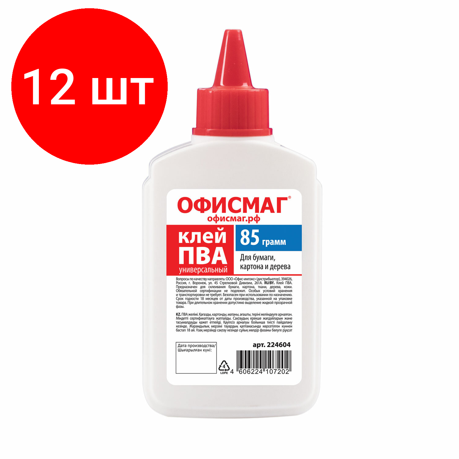 Комплект 12 шт, Клей ПВА офисмаг (бумага, картон, дерево), 85 г, 224604 интересное: