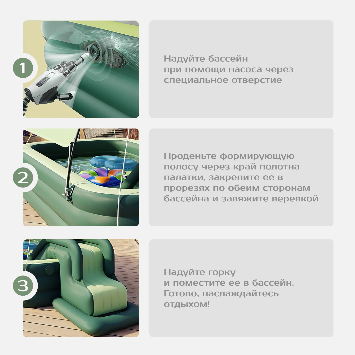 Детский надувной бассейн, складной 2.6 метра зеленого цвета + тент + горка + беспроводной насос
