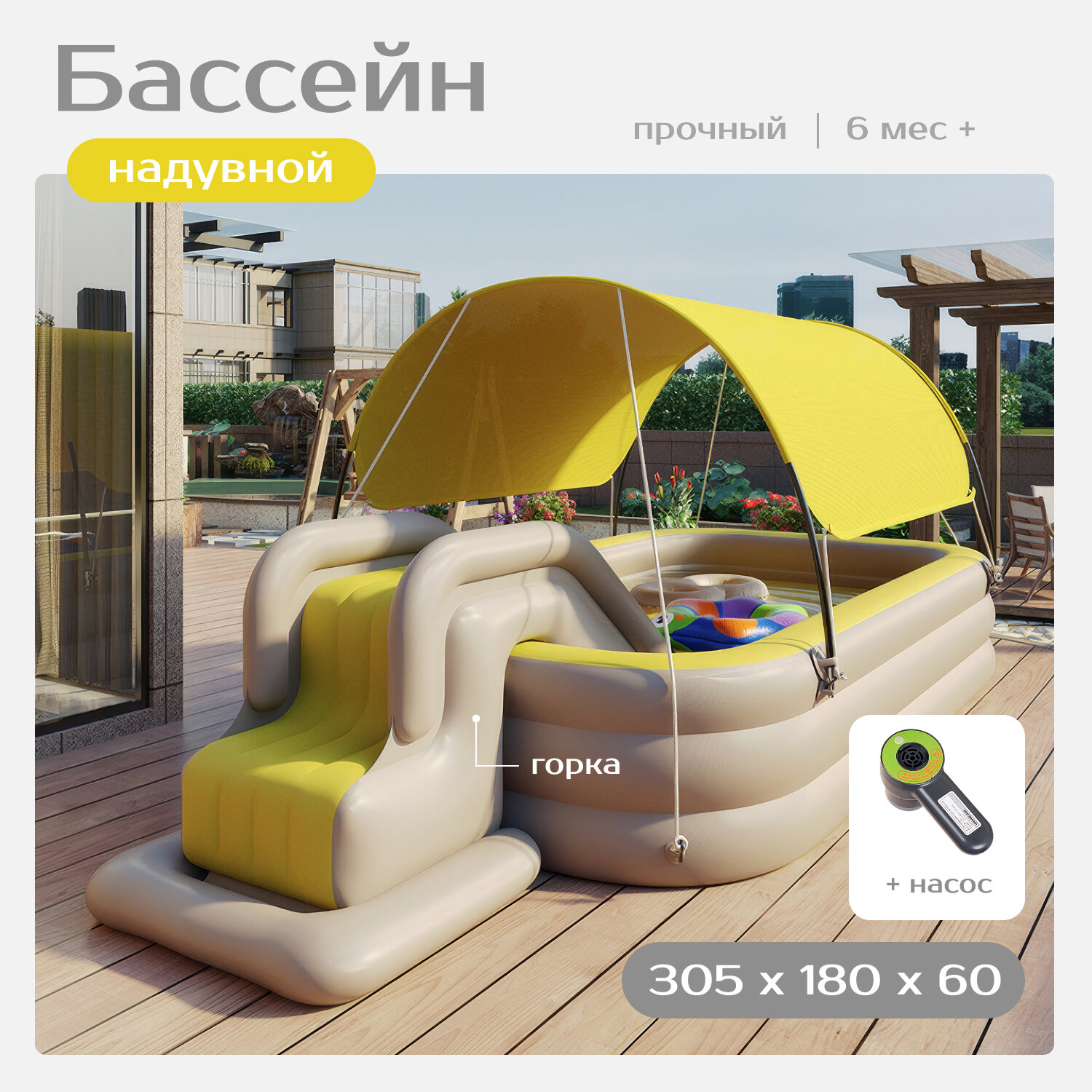 Купить Детский надувной бассейн, складной 3 метра желтого цвета + тент + горка + беспроводной насос