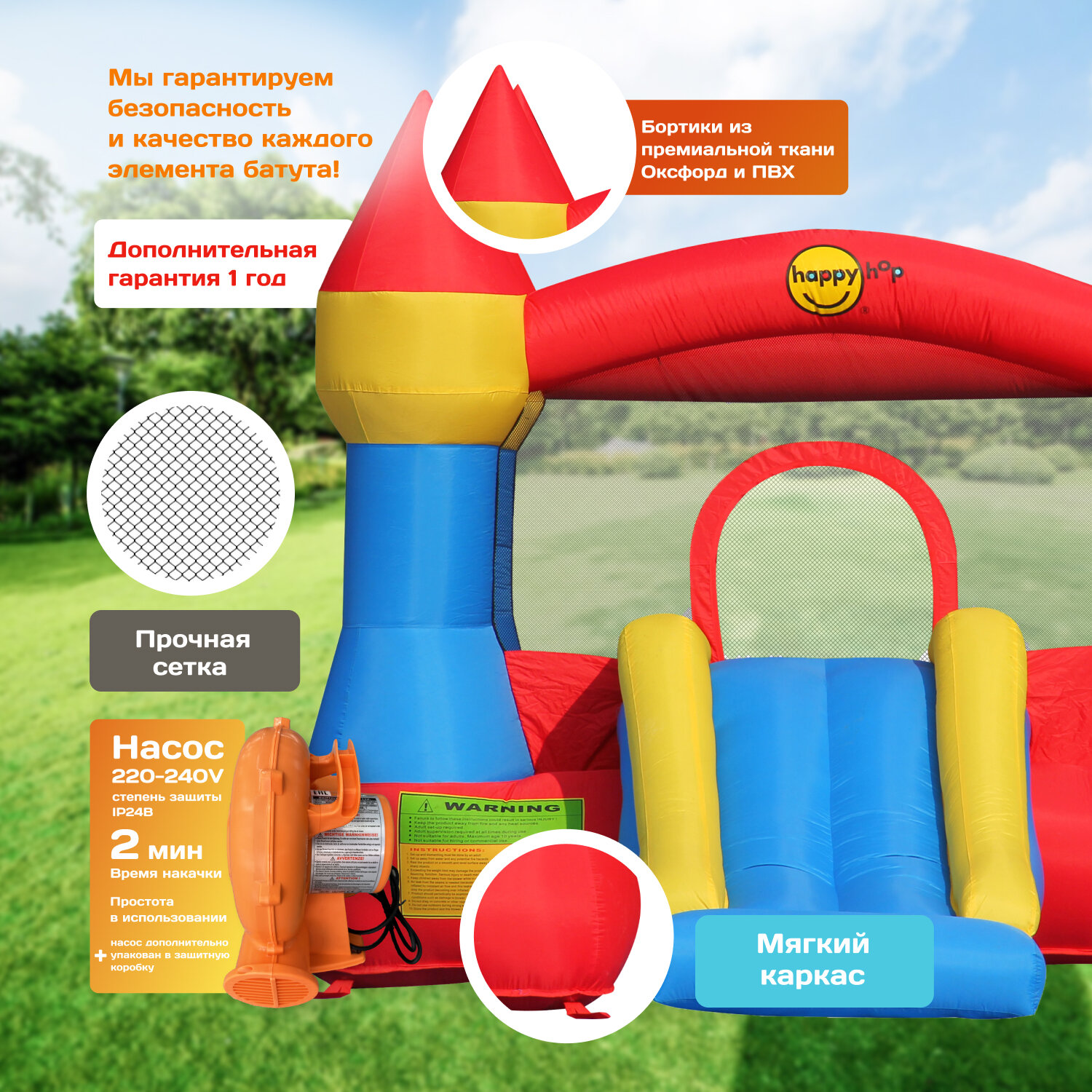 Детский надувной батут для дома и улицы Happy Hop "Попрыгун 2", с горкой, с защитной сеткой, 215х154х140 см